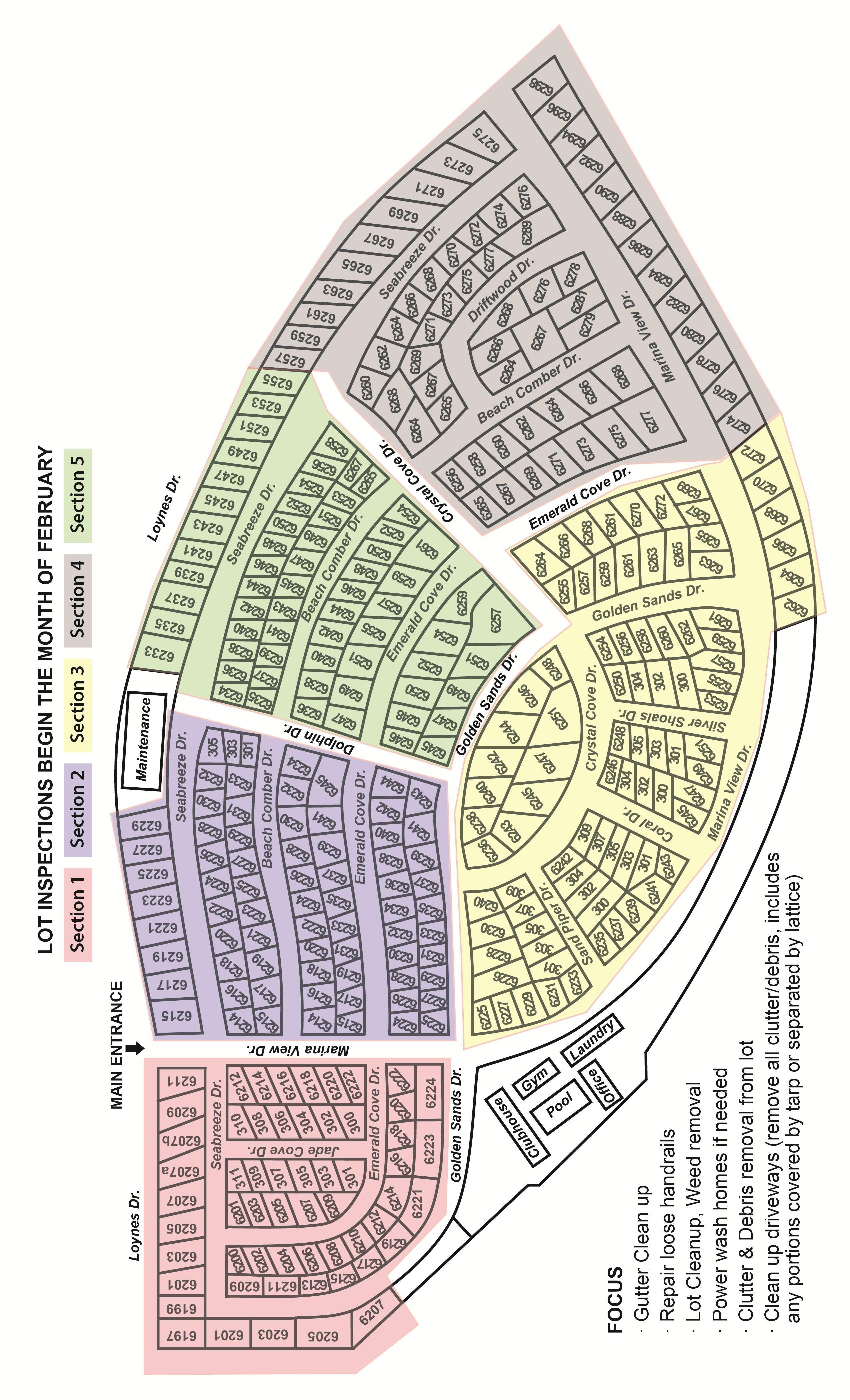 We have park wide Lot Inspections scheduled beginning February. We’ll be breaking up the park into sections. See the Lot Inspection map within for your section. Please take immediate steps to get your lots into shape by removing weeds, clutter and debris from your lot, gutters and driveway, regardless if you’re in a later numbered section or not. Be advised, you will only be given a select number of days to address any issues brought up during the lot inspection. We will do our best to work with each resident, but if it becomes necessary for us to arrange rule compliance for your lot, you will be billed for the cost of maintenance.