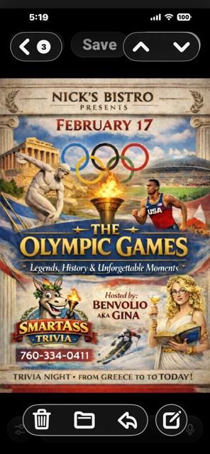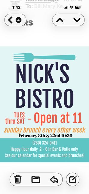 • BUNCO, is a group that meets once a month during the season in Sat. 1 at 6pm on the first Monday of the Month. For information call Kathi Parkhurst 760-285-1262.