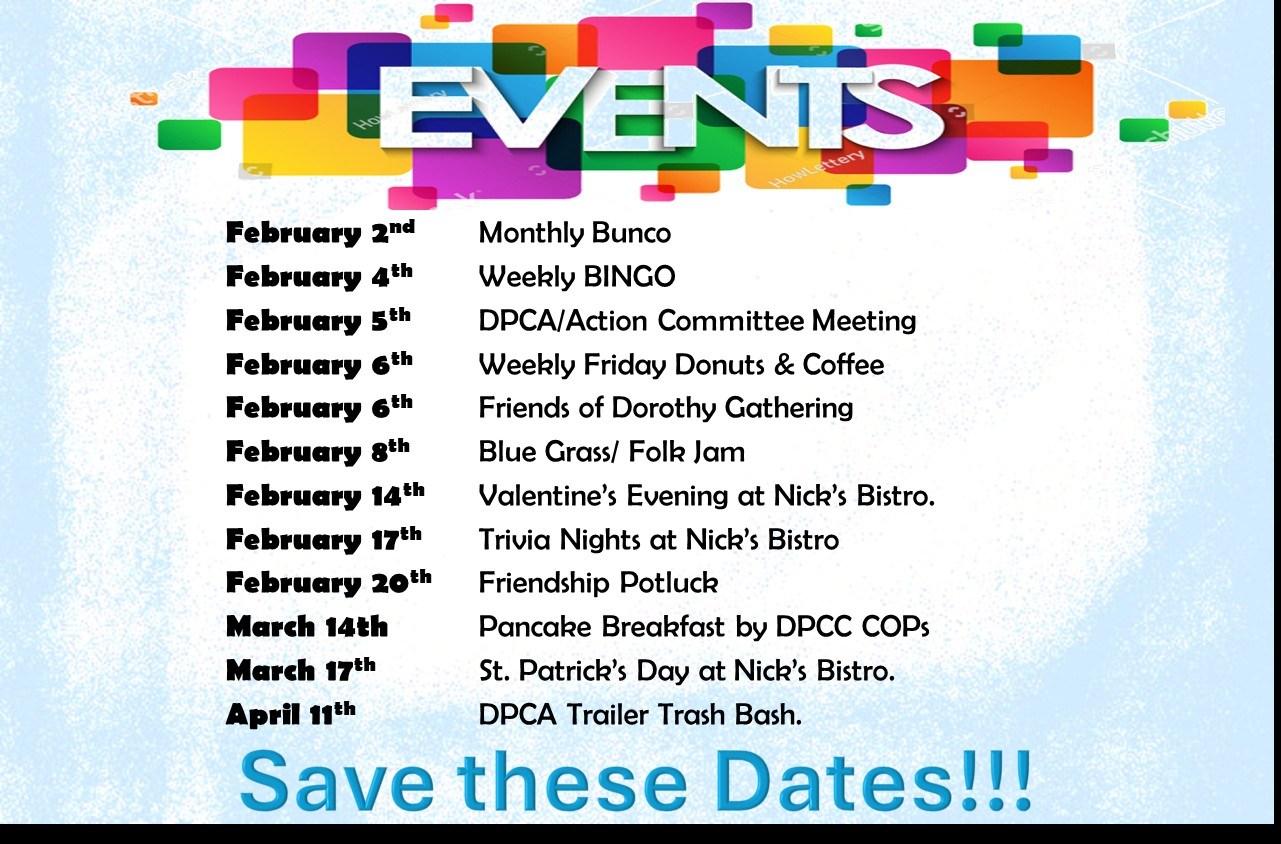 Please email your events/information in PDF/WORD/JPEG/GIF or Similar Format so that it can be copied/edited if required to place in the “Appropriate Page or portions of a Page”, by the 12th or sooner of the month before publication. Plus be sure to send Calendar items that might need to be updated or added to this publication. “SNOWBIRDS” send your email to the editor if you would like the COURIER emailed to you while you are away. thedpcccourier@gmail.com