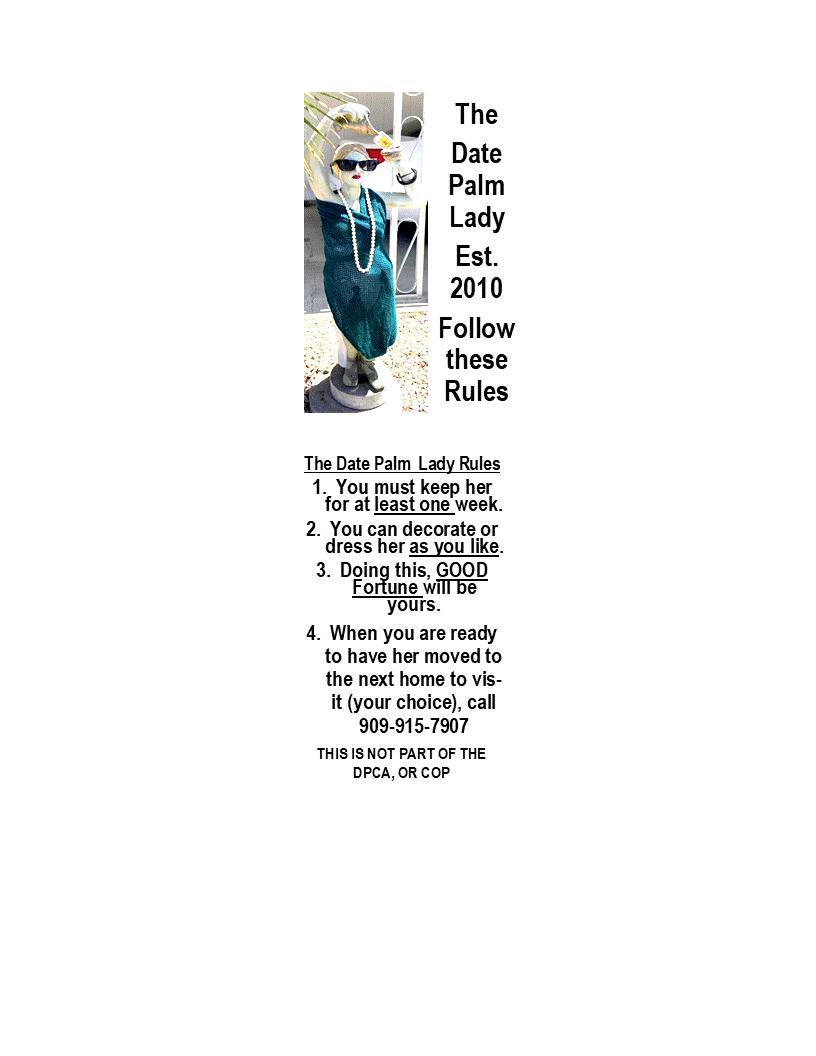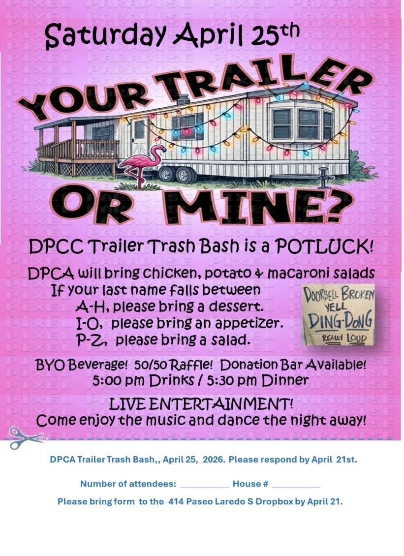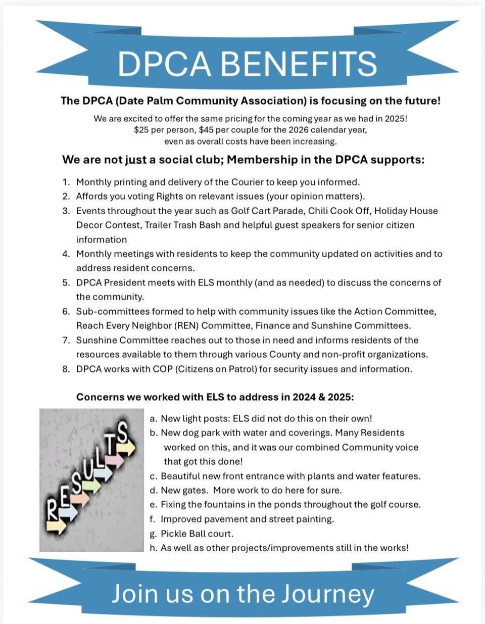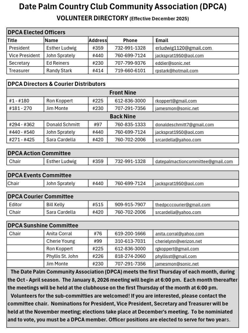 • The DPCA ( Date Palm Community Association) is not an HOA in legal terms. Our DPCA service organization is a social group for the entire community and does ask for membership. This group is open to all residents and charges $25 per person or $45 per couple per year. There is an elected Executive Board made up of President, Vice President, Secretary, Treasurer, plus Directors and Committees. The Directors serve specific areas of the community and the committees are: Action Committee, Sunshine Committee, Social Committee and others as needed. The Courier is paid for by the DPCA. The DPCA meets the first Thursday of the Month during the Season (October thru April) at 6pm in the Clubhouse. Come and check it out, always a good time (cake & coffee).