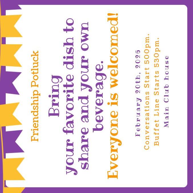 • FRIENDSHIP POTLUCK, 3rd Friday of every month in the Clubhouse at 5:00pm, everyone welcome.