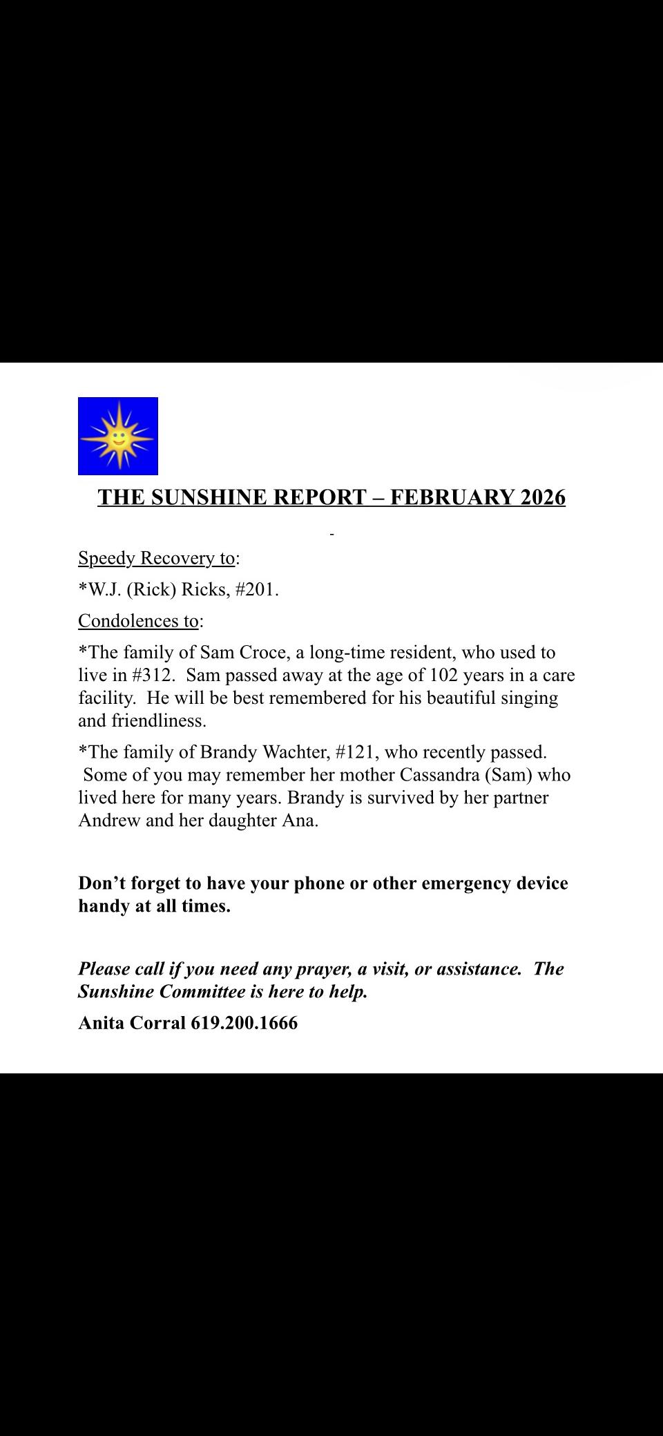 COP: Call COP they are here to help us. In case you need a Resident Notice of Absence we have some available at the Administration Office.