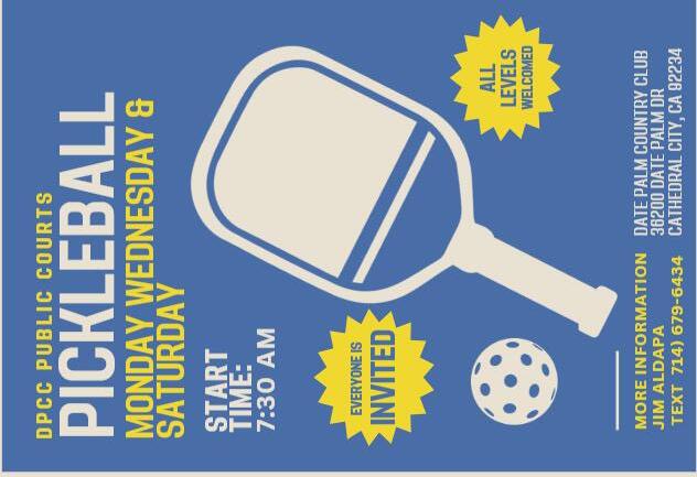 • PICKLE BALL, 8am (or 7am summer) on the pickleball court Monday, Wednesday and Saturday.