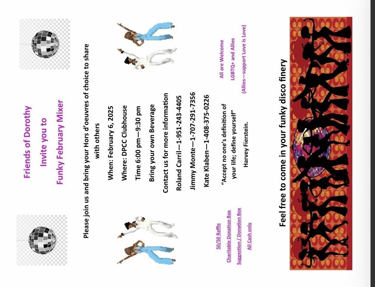 • Friends Of Dorothy is held the First Friday of every Month in the Clubhouse 6pm to 9:30pm.