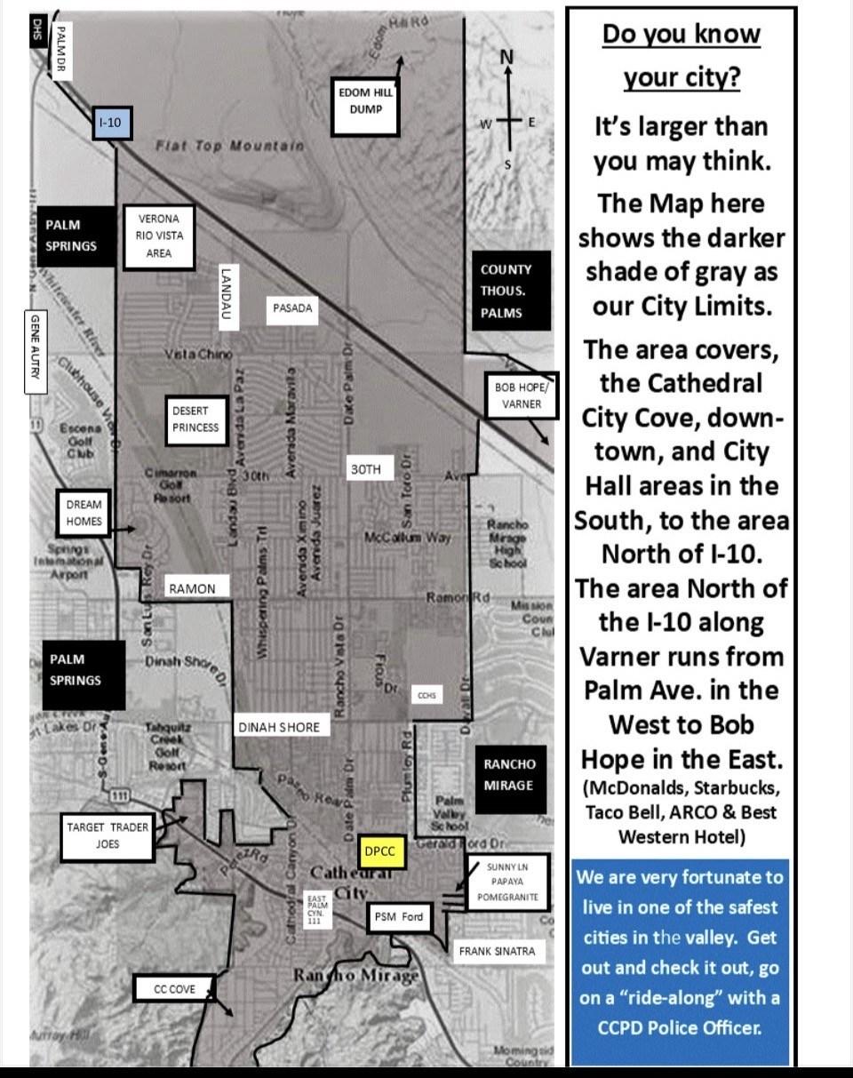 If you are interested in joining your Citizens On Patrol Volunteer Organization please come to a meeting the First Thursday of Each Month in the Sat. 2 COP Office 760-328-3556 or call 909-915-7907.