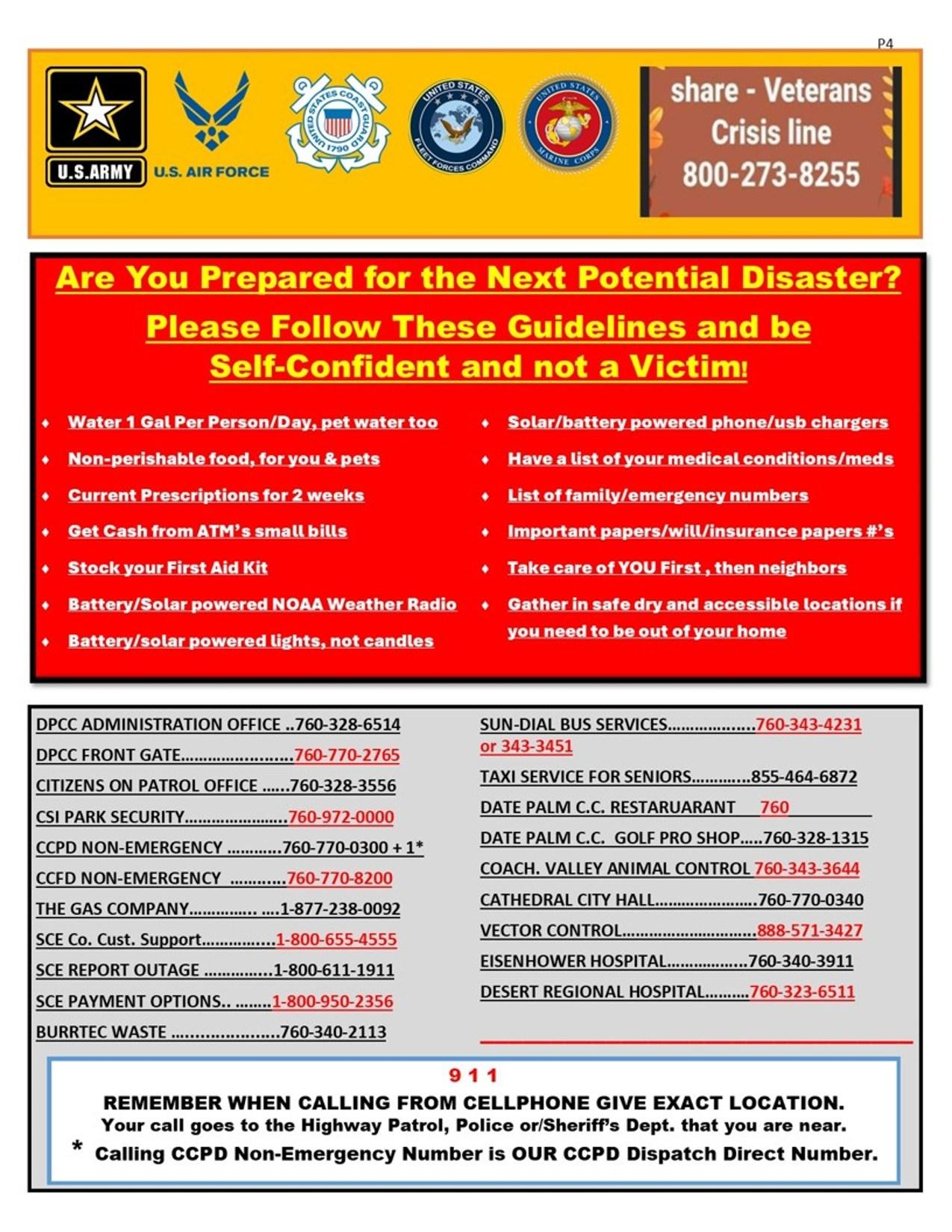 • C.O.P. (Citizens On Patrol) Volunteers from our community. They patrol the streets day and night in Golf Carts or their cars. Also, COP will do “Vacation Checks” on the perimeters of homes while people are away. COP asks for an approval request form to be completed for these home patrols. Our COP meets monthly in the COP office at Satellite 2 at 3p the first Thursday throughout the year. COP also assists the local first responders as required and offers “emergency equipment” and home safety items for sale. In addition, COP offers American Flags for sale and collects/retires old American Flags. COP answers their office phone 24/7, (760)328-3556.