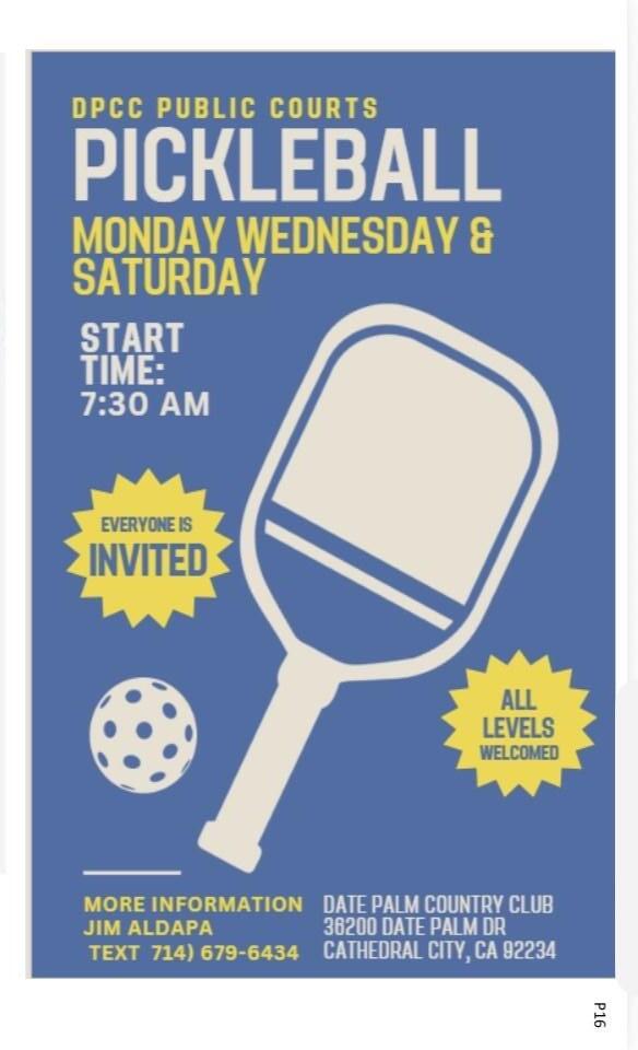 • PICKLE BALL, Check Flyer for times, on the pickleball court Monday, Wednesday and Saturday.