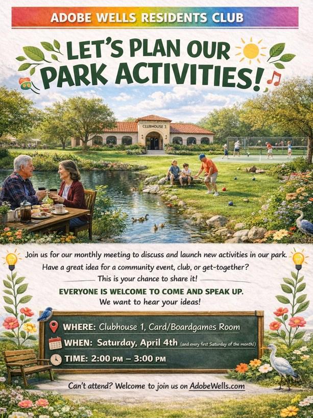 The Adobe Wells Events Group purpose is to plan and host special activities (i.e., themed parties, rummage sales, etc.) for the Adobe Wells Mobile Home community. Please direct any other comments or issues to the Adobe Wells Park Business Office. In addition, the Events Group assumes no responsibility for this publication or any of its contents and shall not be held to blame for any item that is published in The Adobian unless it has prior approval of the Events Group.