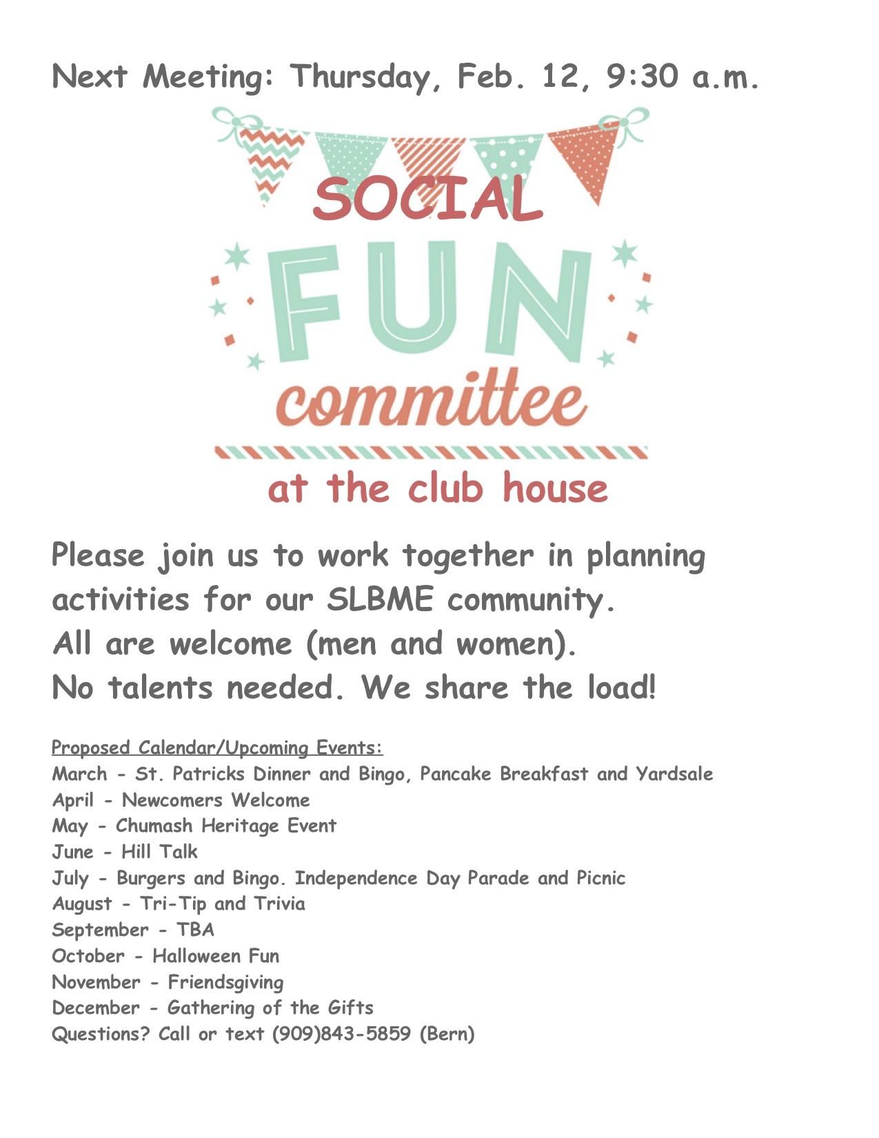 SC-Social Committee is the 2nd Thursday every month at 9:30 a.m. in the Clubhouse. All residents are encouraged to come.