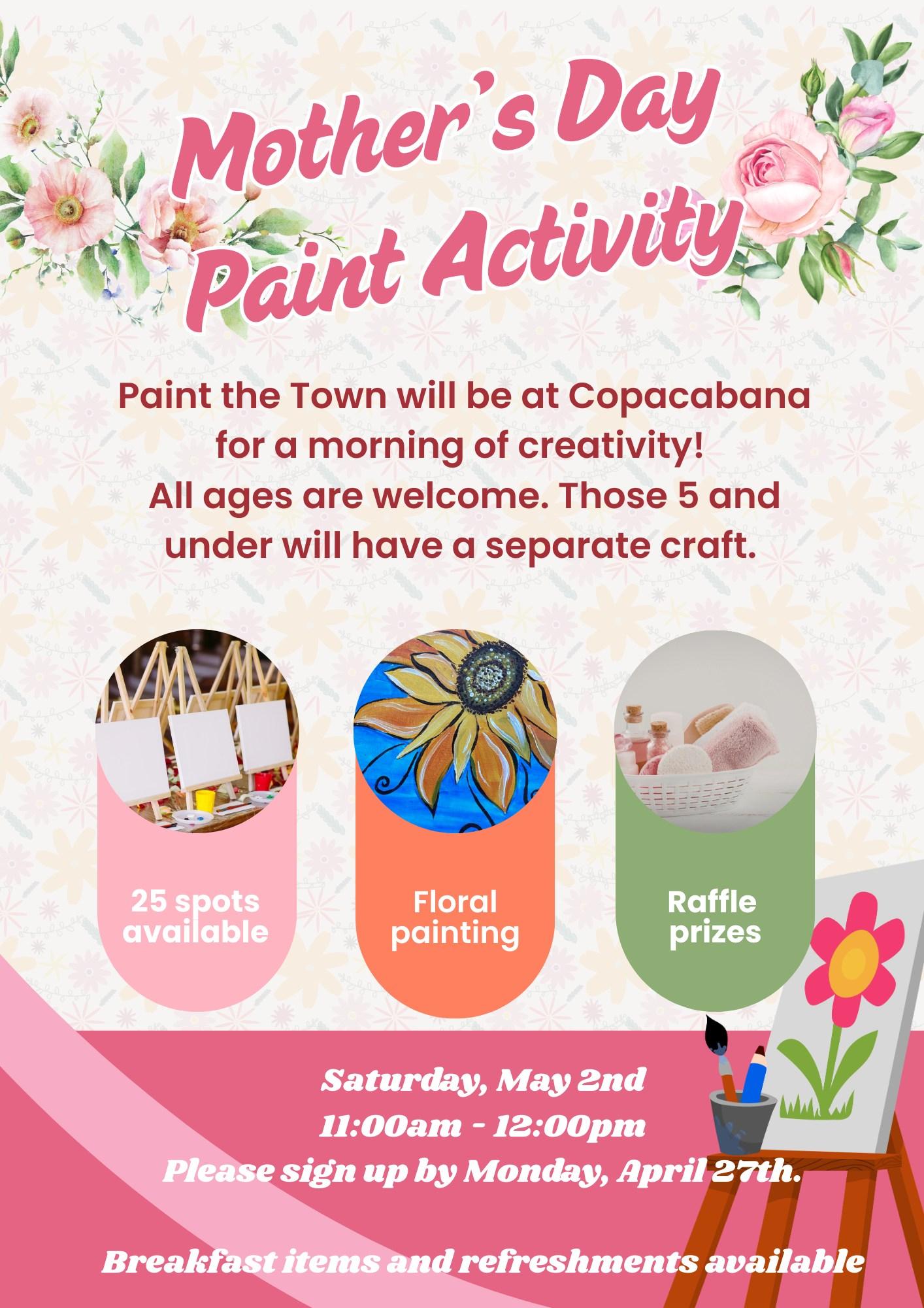You’ll get breakfast, enjoy a painting class (courtesy of Paint the Town), a Spa Basket Raffle…isn’t that a fun way to spend a Saturday?
