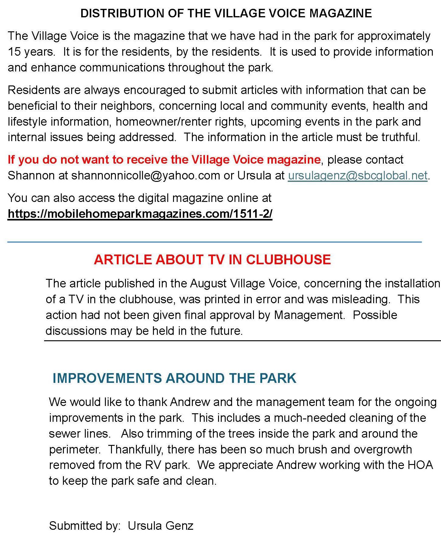 The Village Voice is an independent publication. Our goal is to provide you access to unbiased information regarding our community and other mobile home related news. There is no outside influence from the City of San Diego, FollettUSA, LVVSDHOA or other entities/persons; however, we accept submissions from all sources. Submissions that show bias towards a resident or multiple residents will either be redacted or not included. The publication is produced by volunteers. No one other than the Editorial Team should be soliciting for assistance. If you would like to volunteer, please email us directly.