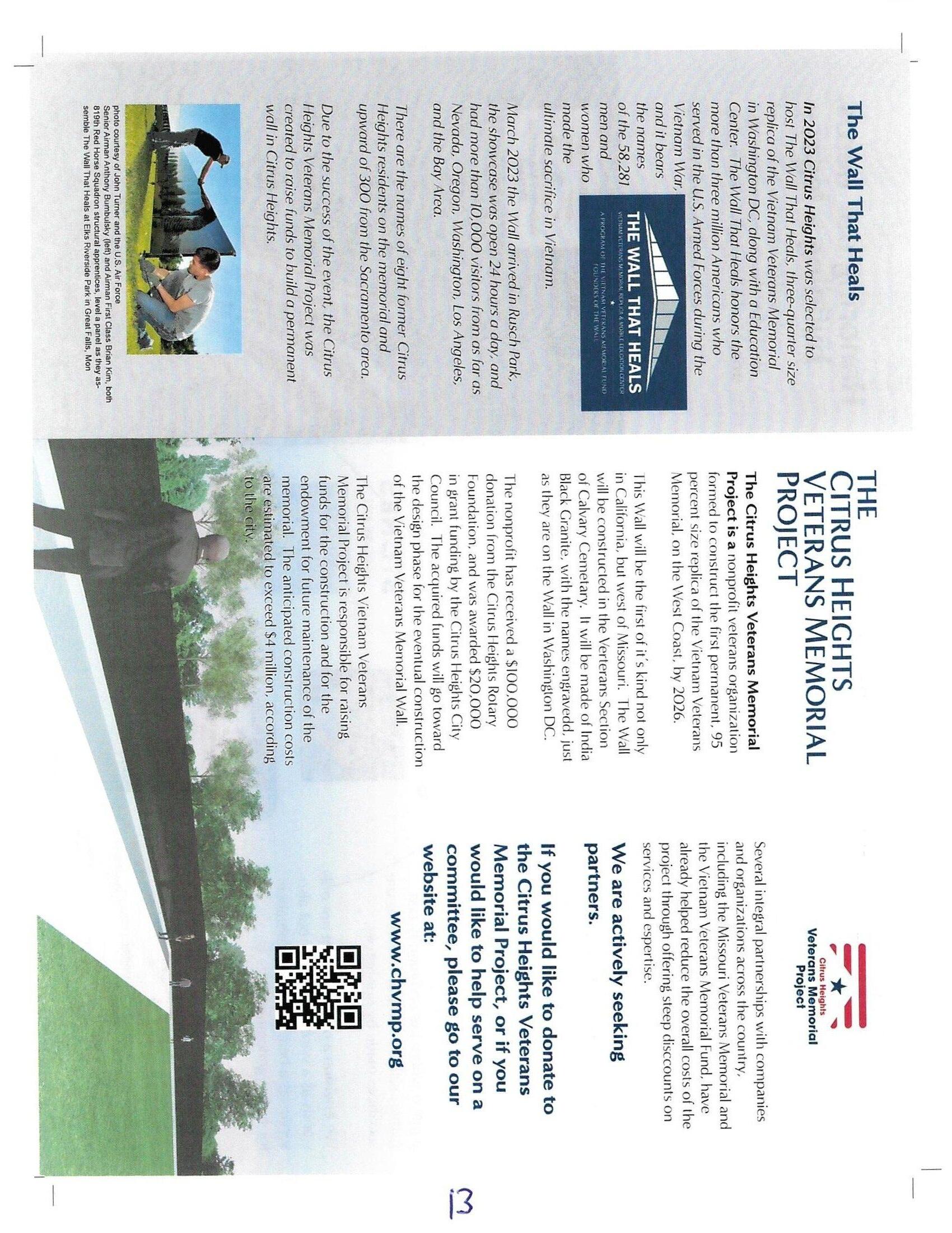The Citrus Heights Veterans Memorial Project is a nonprofit veterans organization formed to construct the first permanent, 95 percent size replica of the Vietnam Veterans Memorial. on the \Vest Coast. by 2026. I his Wall will be the first of it's kind not only in California, but west of Missouri. The Wall will be constructed in the \/erterans Section of Calvary Cemetary. II will be made of India Black Granite. with the names engravedd, just as they are on the Wall in Washington DC. The nonprofit has received a $100,000 donation from the Citrus Heights Rotary Foundation, and was awarded $20,000 in grant funding by the Citrus Heights City Council. The acquired funds will go toward the design phase for the eventual construction of the Vietnam Veterans Memorial Wall. The Citrus Heights Vietnam Veterans Memorial Project is responsible for raising funds for the construction and for the endowment for future maintenance of the memorial. The anticipated construction costs uare estimated to exceed $4 million, according t01théyc,ity.