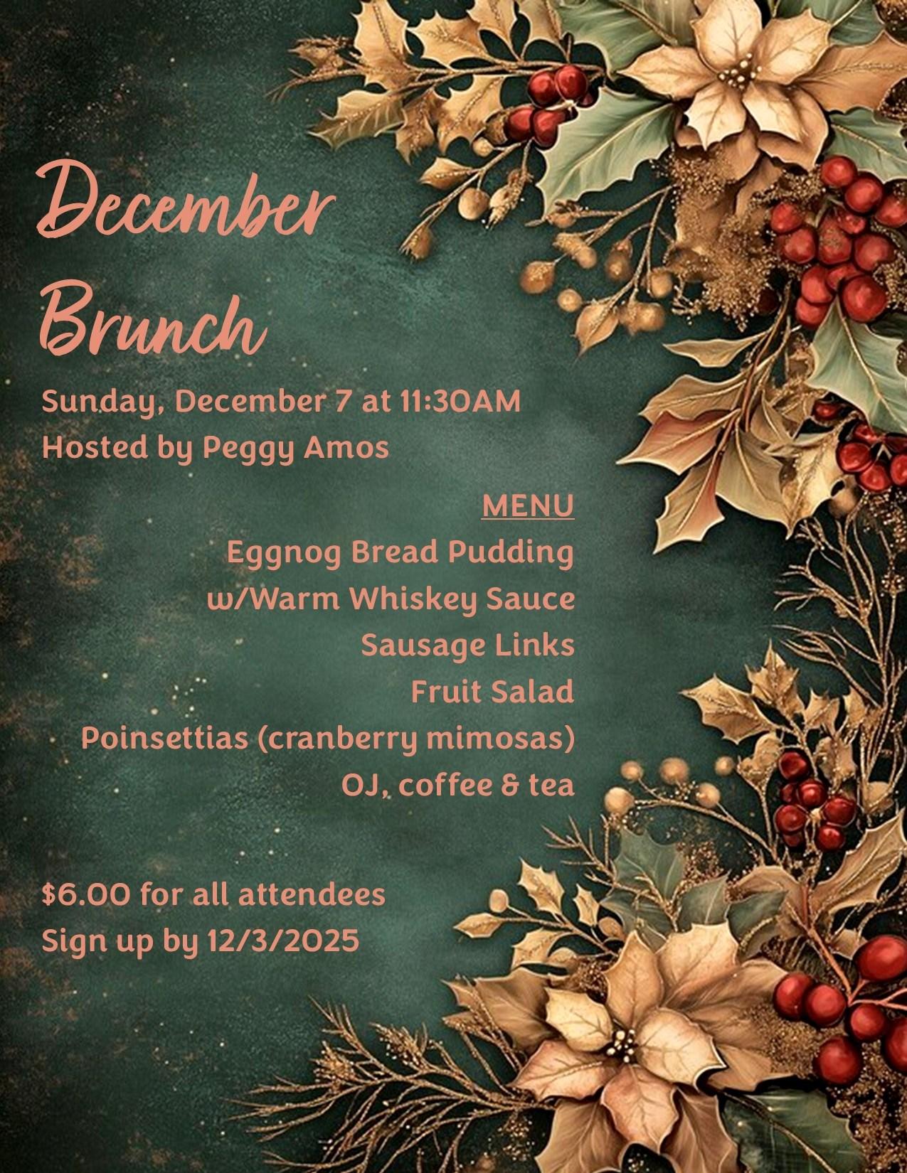 • The December Brunch is on December 7th at 11:30 a.m. Hosted by Peggy Amos.