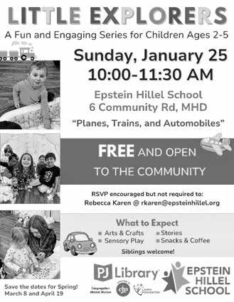Little Explorers is a Sunday morning series for children ages 2-5. Children play and explore with arts and crafts, sensory activities and stories. Parents get to connect with other parents — with coffee and snacks. Siblings welcome. RSVPs encouraged (but not required). Email rkaren@epsteinhillel.org. Free and open to all.