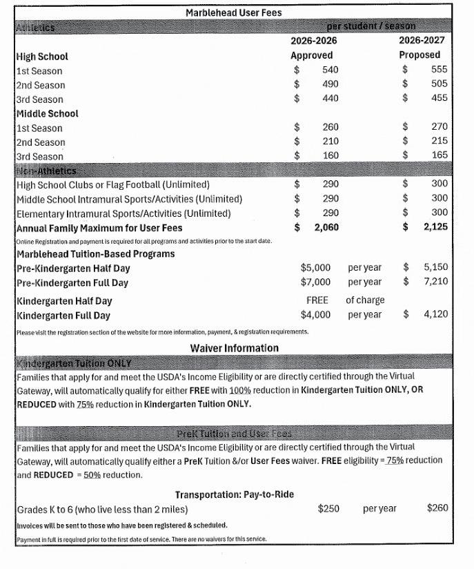 Fees for one season of sports at Marblehead High will rise from $540 to $555. The annual perfamily maximum for family fees will jump from $2,060 to $2,125. Fees for preschool and kindergarten are also increasing. The fee for full-day kindergarten is going from $4,000 to $4,120. Families can apply for financial waivers.