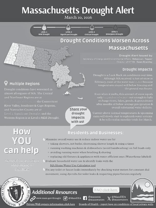 Chief Jason Gilliland shared this drought alert from the state: “The Executive Office of Energy & Environmental Affairs and the Drought Management Task Force declared critical drought conditions in central and northeastern Massachusetts, with significant drought conditions in most other areas of the state. As we all know, this increases the outdoor fire risk at the very time more people start to spend more time outdoors,” according to the message.
