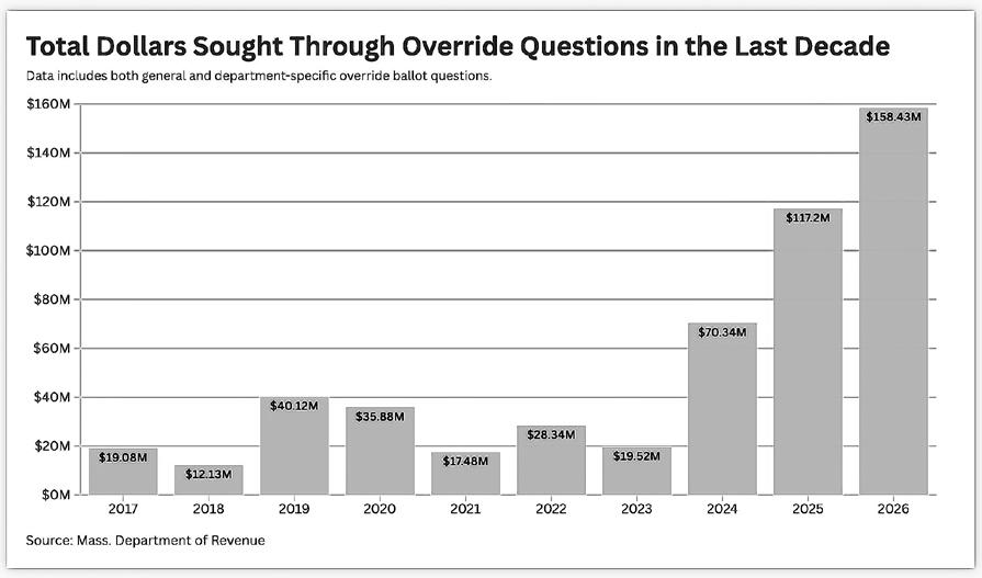 In fiscal year 2026 alone, 54 municipalities placed 74 override questions on local ballots, seeking more than $158 million in additional tax revenue — the second largest total since the early 1990s.