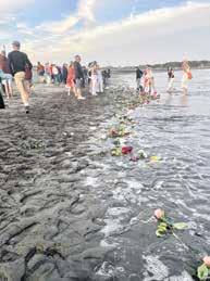 Popperson invited everyone to take a flower and throw it into the ocean. The shoreline quickly became covered in roses, carnations and more.