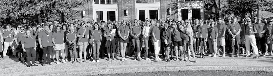 Teachers, dressed in red, gathered outside the Veterans School on Aug. 29 before walking in together to hear interim Superintendent John Robidoux’s convocation message.