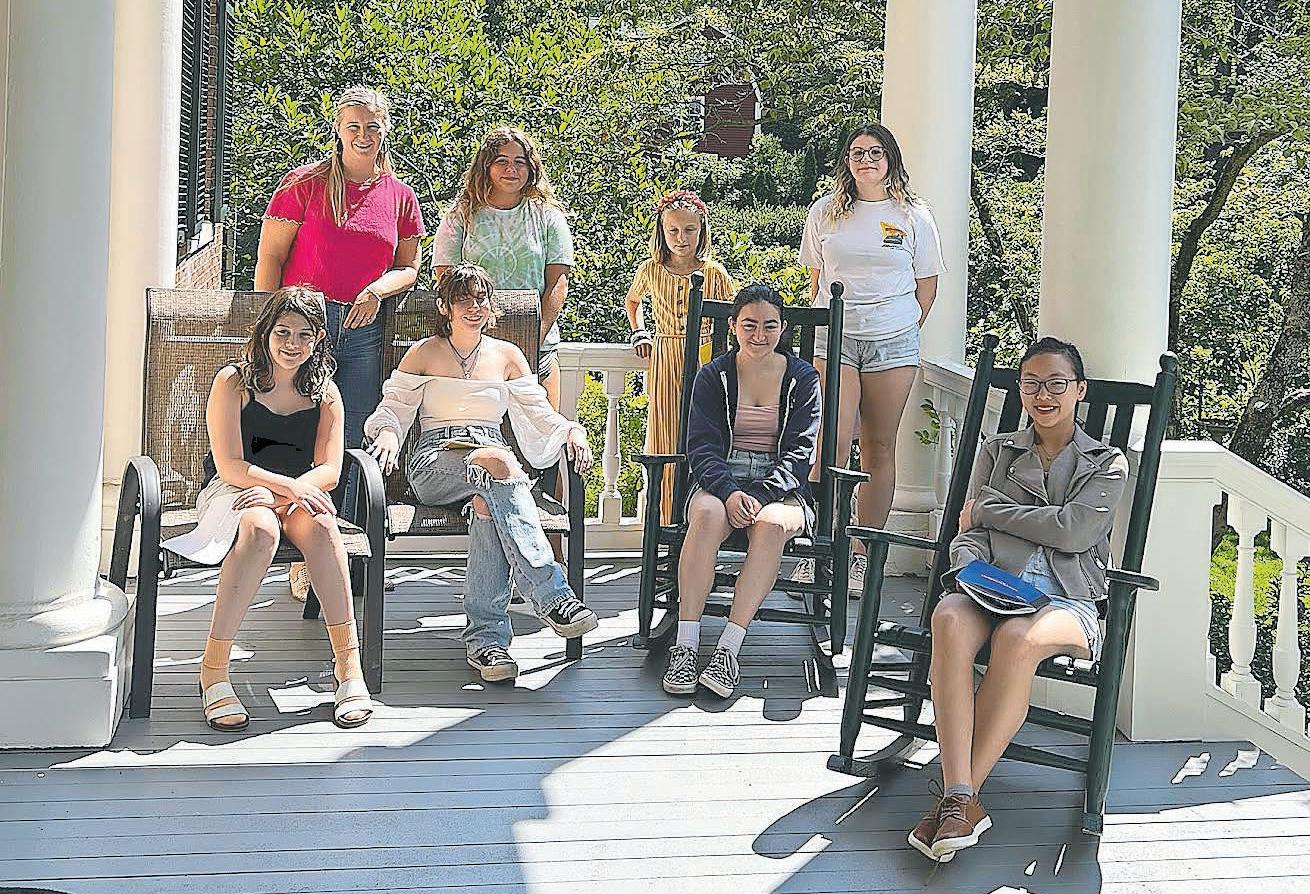 With poet and educator Katie Naoum Rogers, back row, left, are participants in Rogers’ weeklong writing workshop held at the Salem Athenaeum earlier this month. Students are, back row, from left, Abby Corrigan, Alice Girling and Paloma Russel; front row, from left, Finna Walsh, Sherrie Esteves, Evelyn Miller and Ella Wanstall. Walsh, Wanstall, Corrigan and Girling all live in Marblehead.