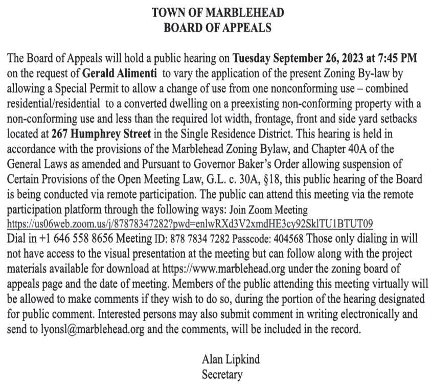 The following boards, commissions and committees have openings for appointed positions. Interested parties should send a letter of interest and resume to the Select Board at Abbot Hall, 188 Washington St., or email wileyk@marblehead. org. For more information, call the Select Board’s office at 781-631-0000.