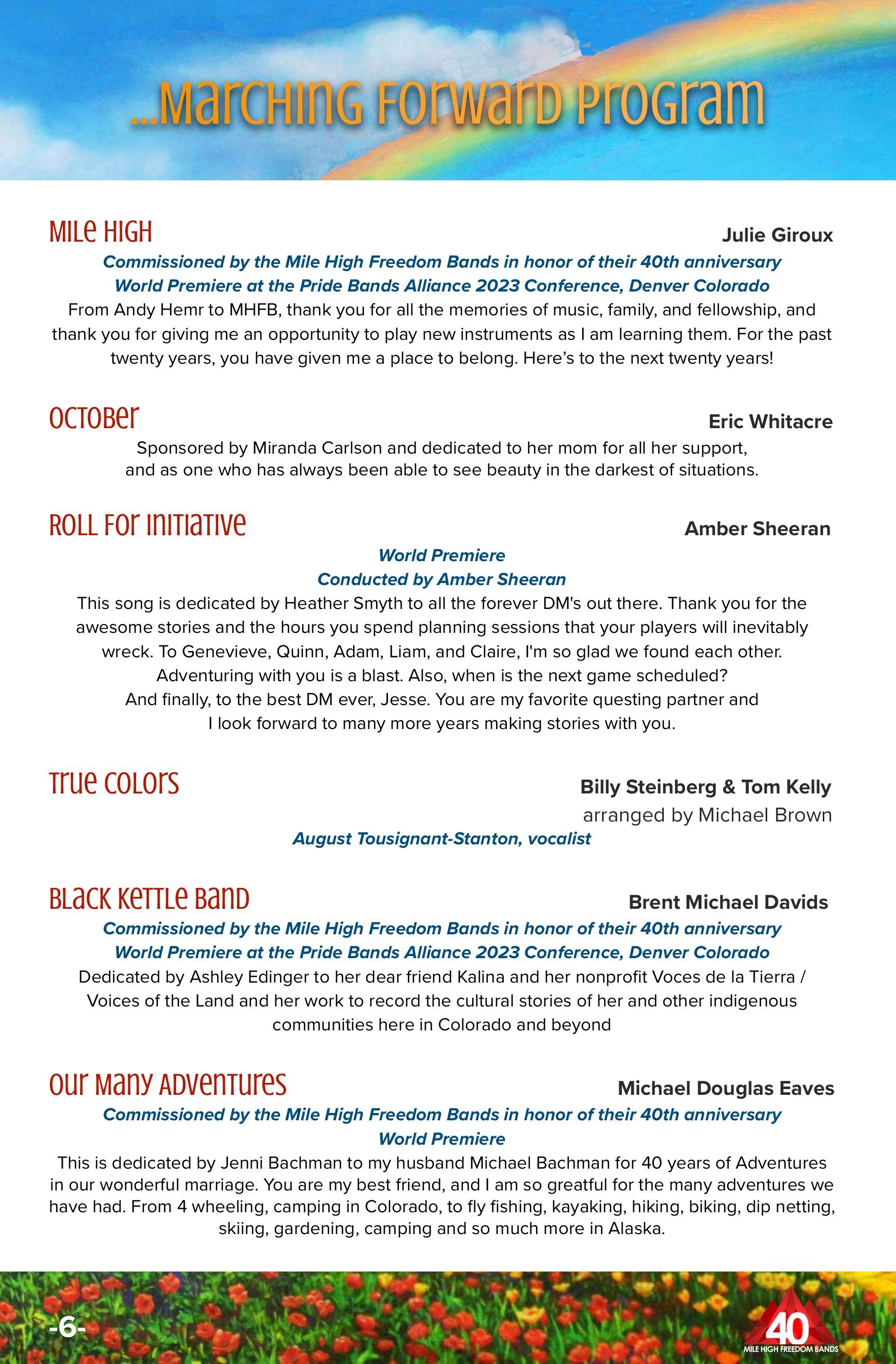 MHFB Winds’ marches forward for the next event our 40th anniversary Ruby Season! After looking back at the past 40 years of MHFB in the last performance, we now look ahead to the future. Join us as we take to the main stage of the famed Ellie Caulkins Opera House for the first time in our history. This concert will feature performances of commissioned works to celebrate our anniversary by award-winning composers Brent Michael Davids and Julie Giroux, as well as the world premieres of three new works by composer Michael Eaves and MHFB Members and composers Amber Sheeran and Kalin Peña.