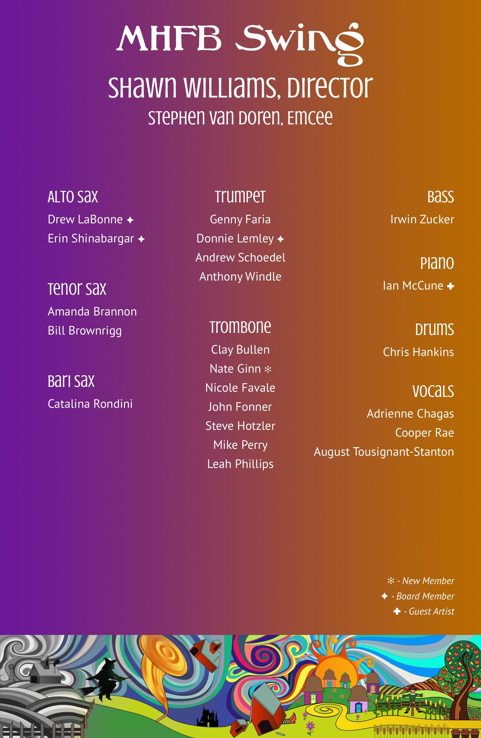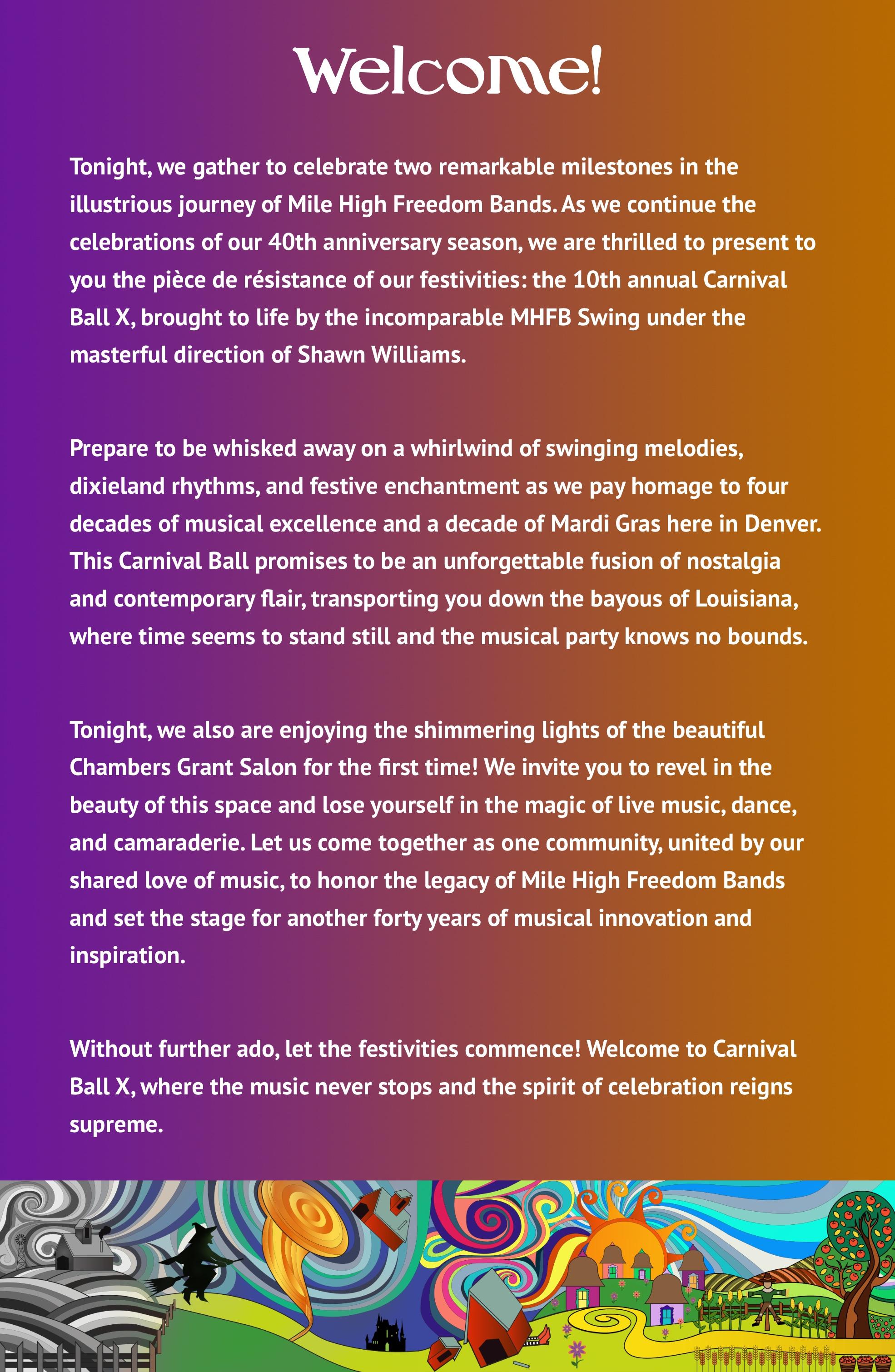 MHFB Swing continues our 40th anniversary Ruby Season celebration with the 10th annual Carnival Ball! Take a trip down the bayou with us as we celebrate the music, food, and traditions of Mardi Gras under the beautiful sparkling stars of the Chambers Grant Salon. It’ll be a great night of dixieland with a little sweet treat straight from New Orleans to the end your night!