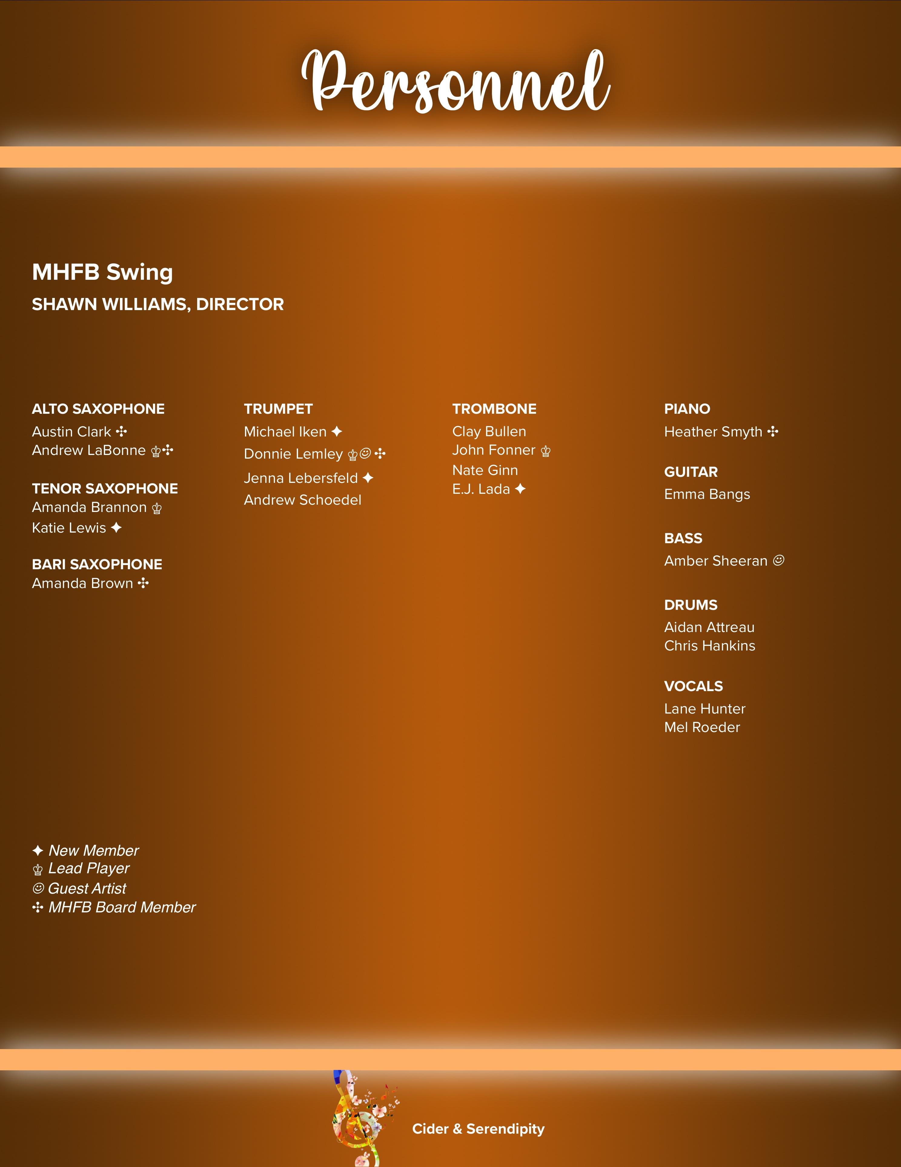 Cider and Serendipity brings together the spontaneity of jazz with the communal joy of a warm fall cider by the fire, creating a unique celebration of connections. This enchanting event fosters a sense of community and harmony, inviting both performers and audience to partake in an unforgettable shared experience. Through the rich interplay of music and taste, we aspire to craft moments of serendipitous connection that linger long after the final note has faded.