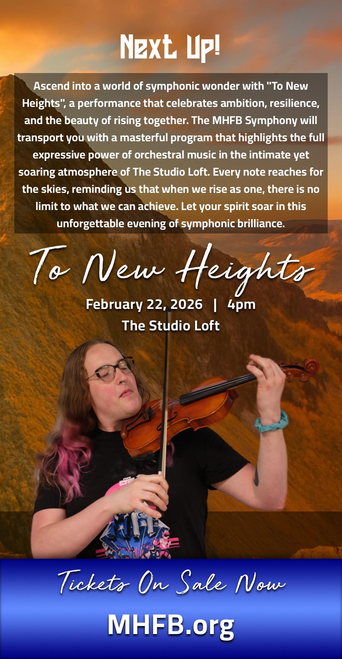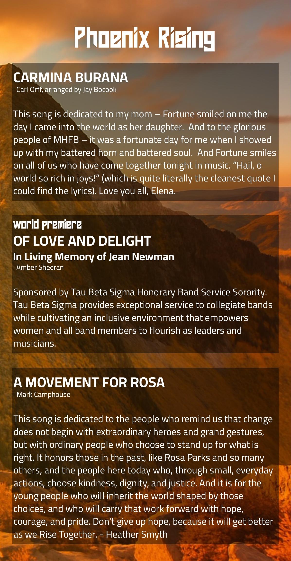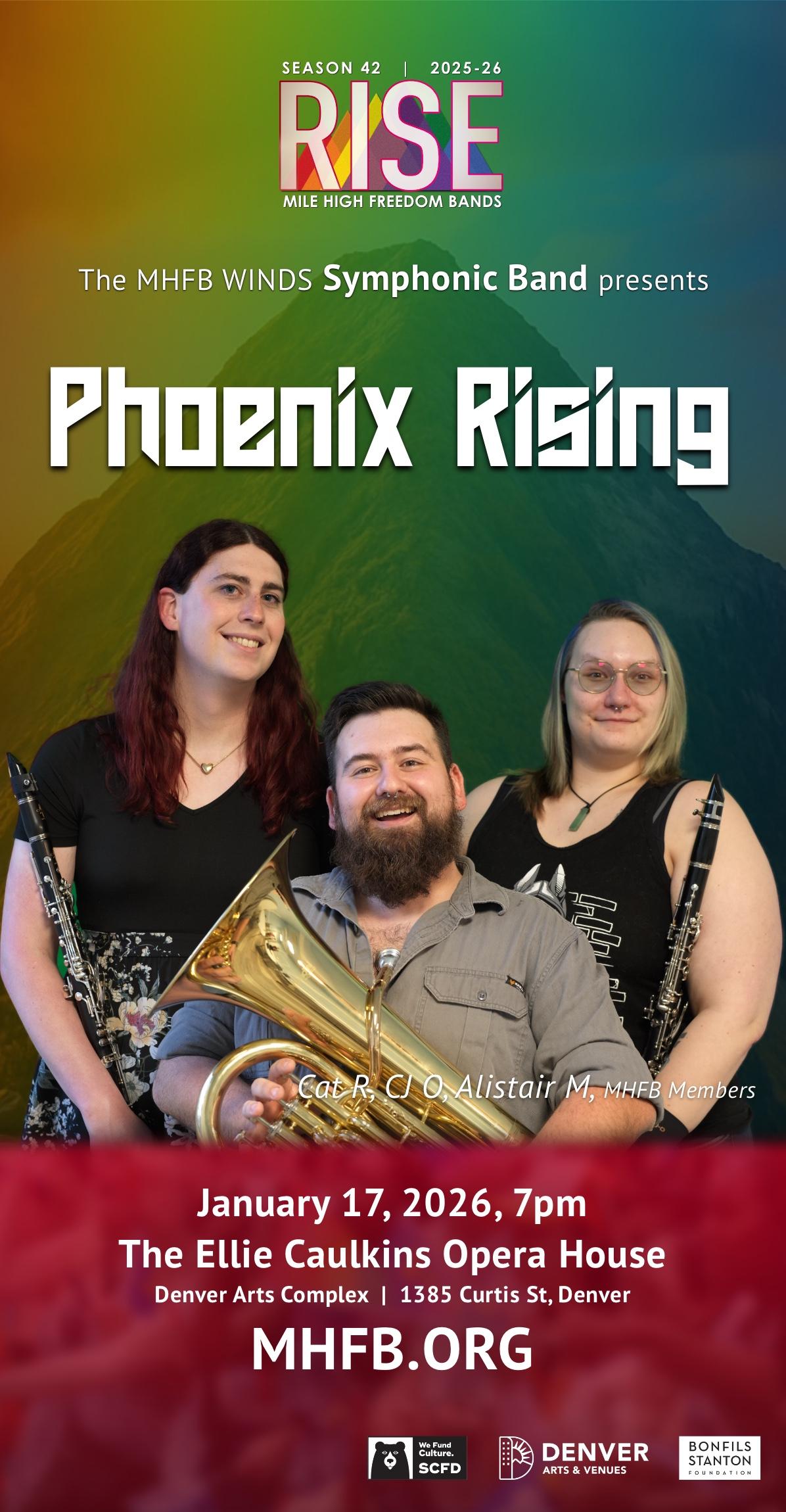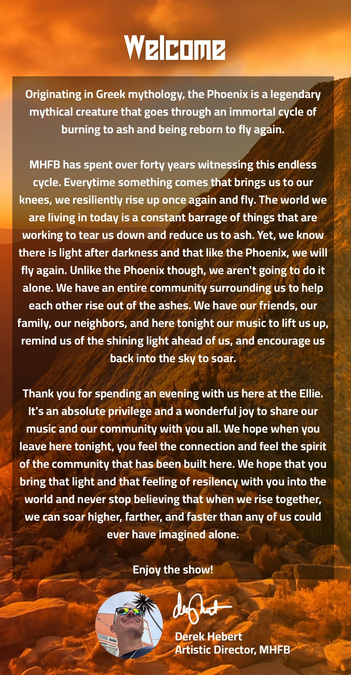 Out of the ashes of despair comes a blazing triumph. Phoenix Rising is more than a concert - it’s a declaration of the human spirit’s resilience. In a world that often feels weighed down by challenges, hatred, and injustice, MHFB Winds presents a transformative program that channels our collective strength to rise above it all. Through bold melodies and sweeping harmonies, this performance tells the story of rebirth: how even in our darkest moments, we find the courage to rebuild, grow stronger, and soar higher than ever before. This concert captures the raw emotion of struggle and the radiant power of renewal. Join us for an unforgettable evening that reminds us of the strength we hold within ourselves and as a united community. Together, we rise from the ashes - better, bolder, and brighter than ever before.