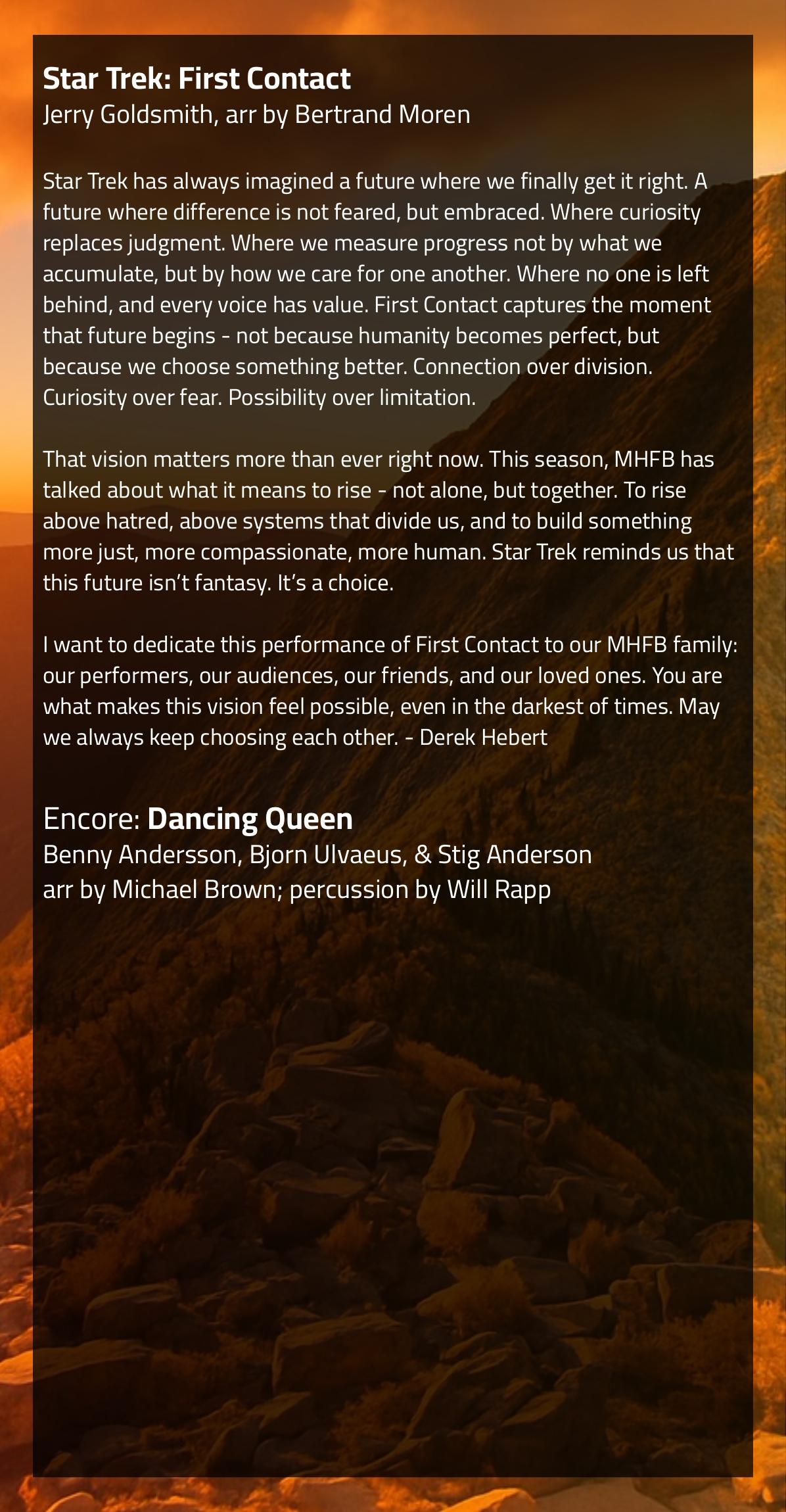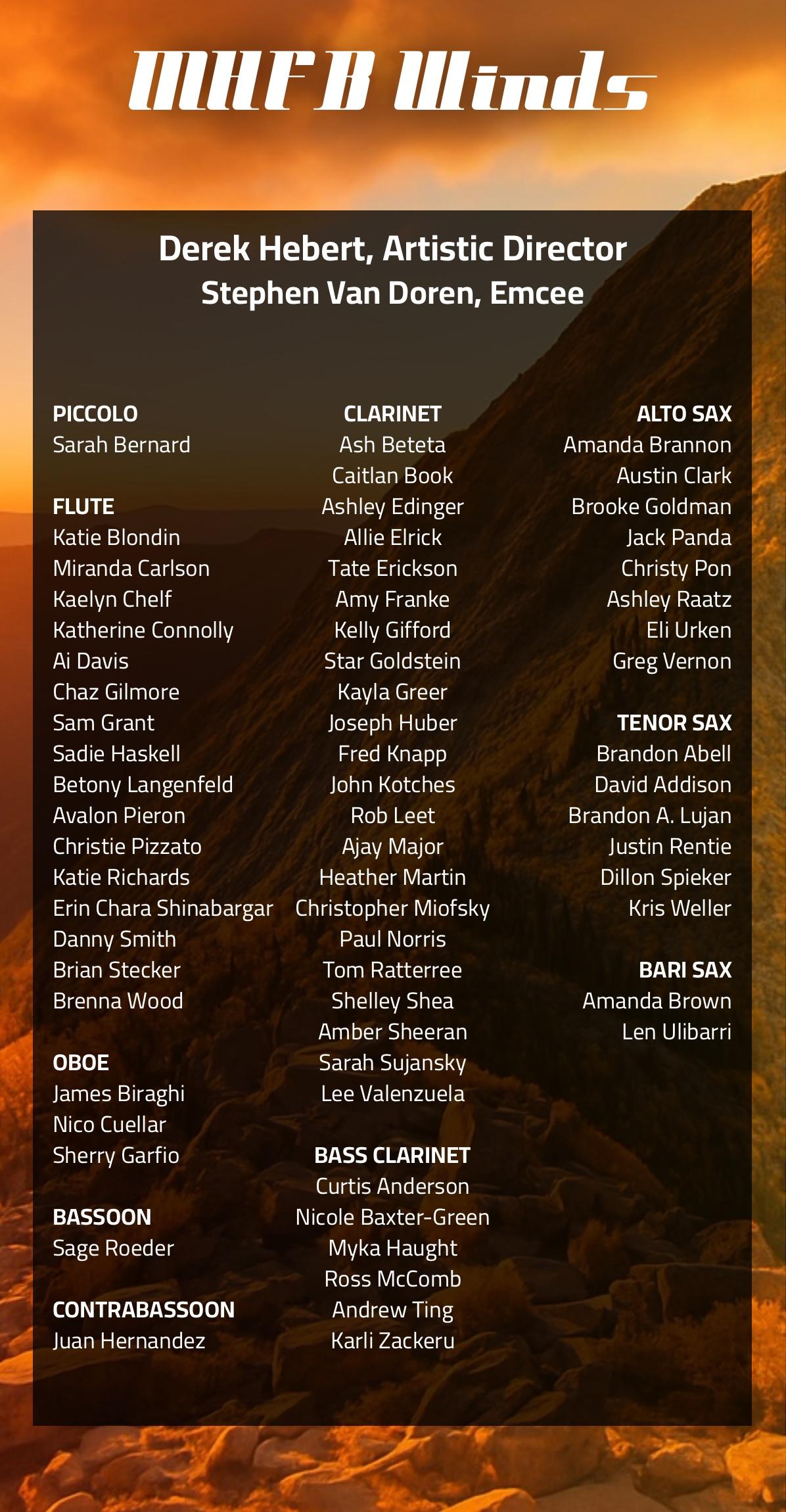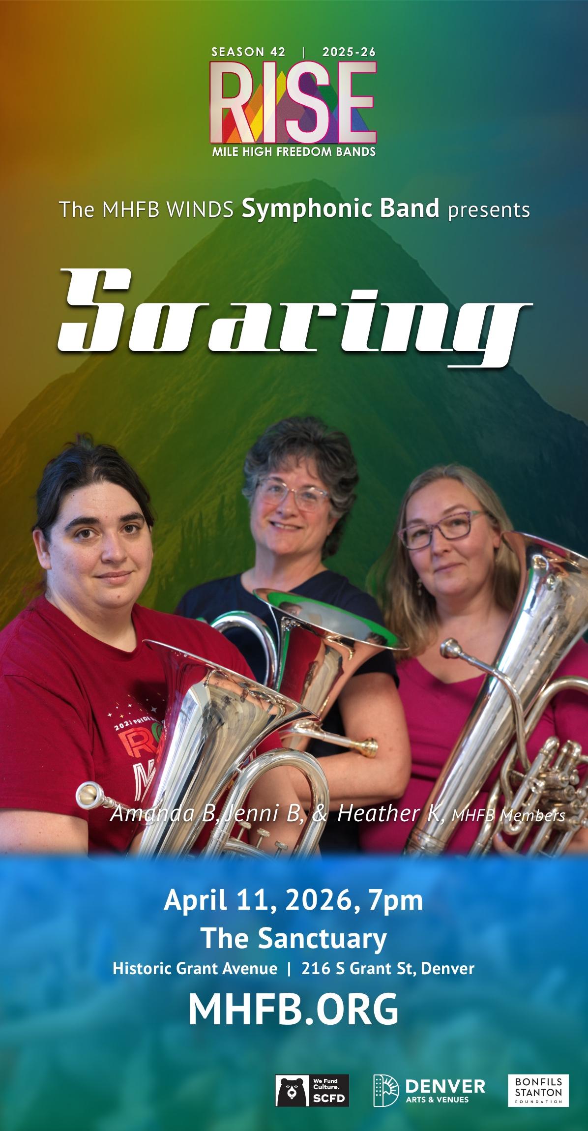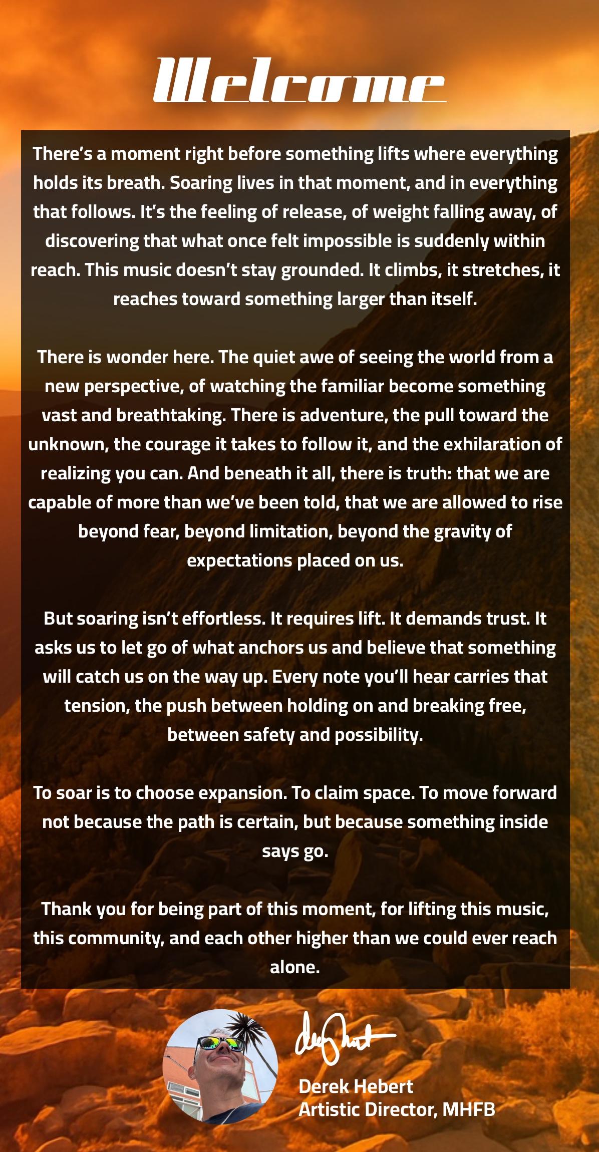 Let your spirit take flight with Soaring, a breathtaking journey through the boundless possibilities of wind ensemble music. MHFB Winds will inspire with majestic melodies and exhilarating crescendos that capture the essence of RISE. This concert embodies triumph and perseverance, lifting the audience to new heights with a program as bold and dynamic as the soaring human spirit. Feel the power of unity and the transformative force of music in a performance that will leave you energized and uplifted. Together, we soar.