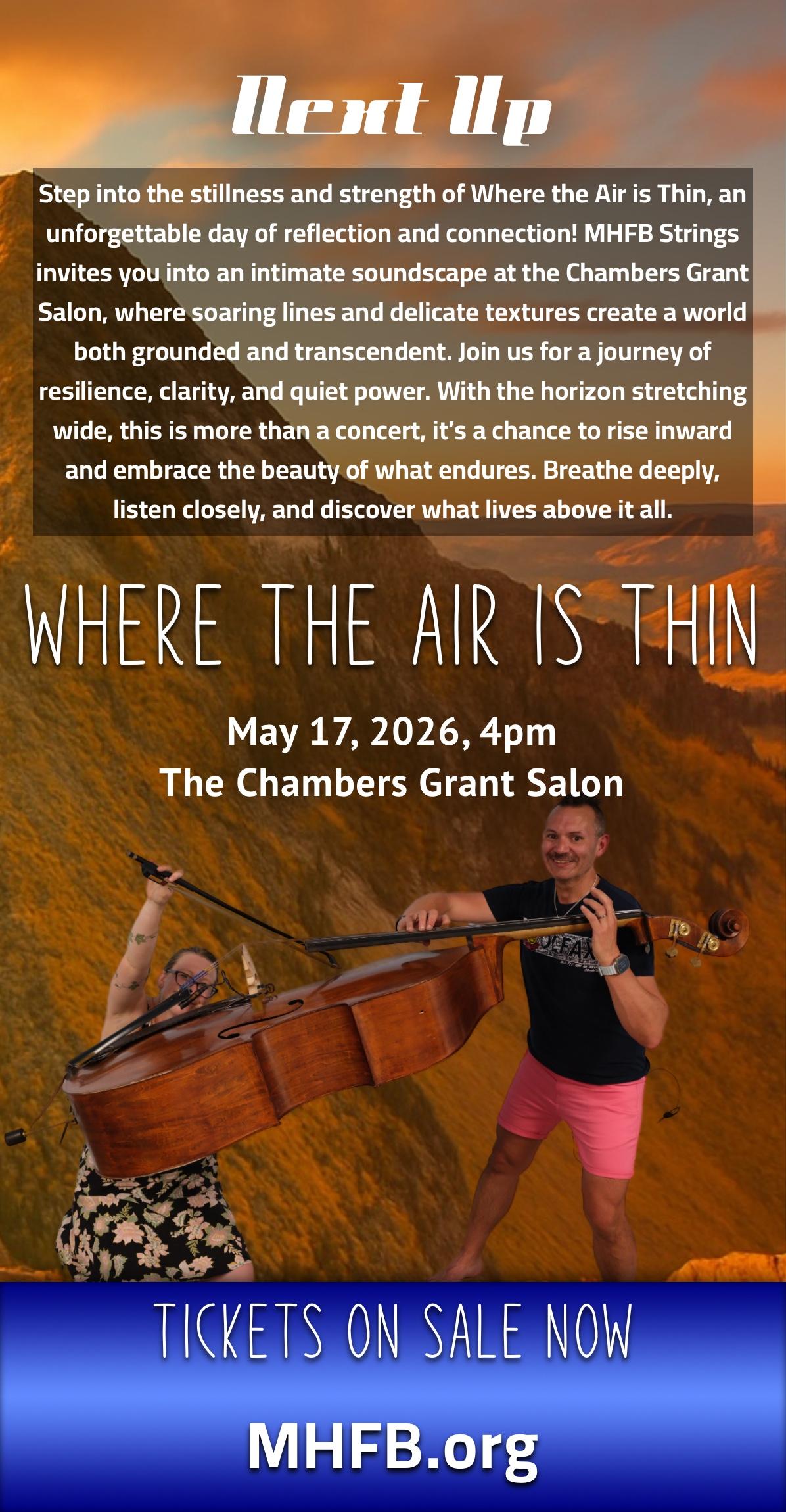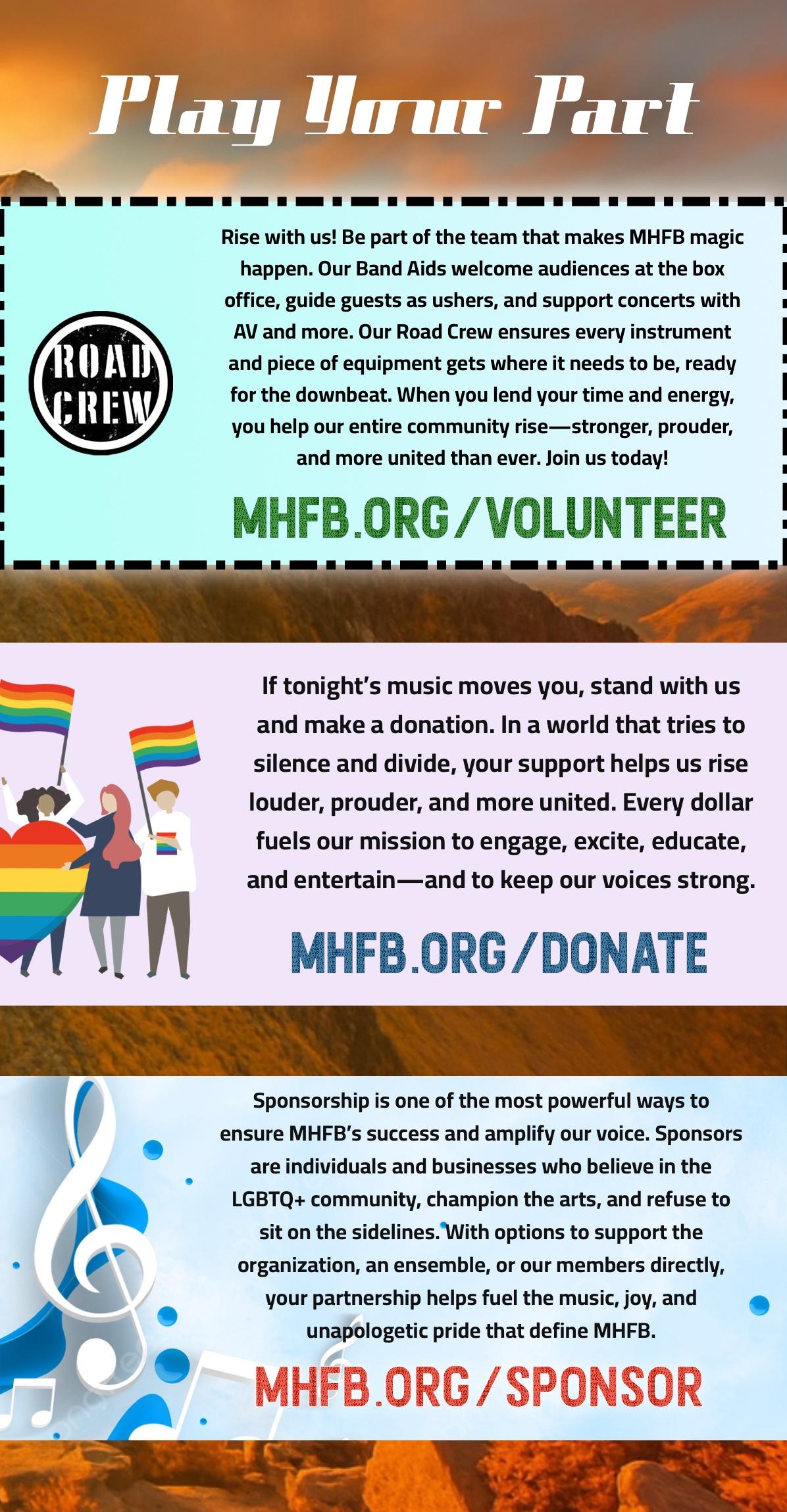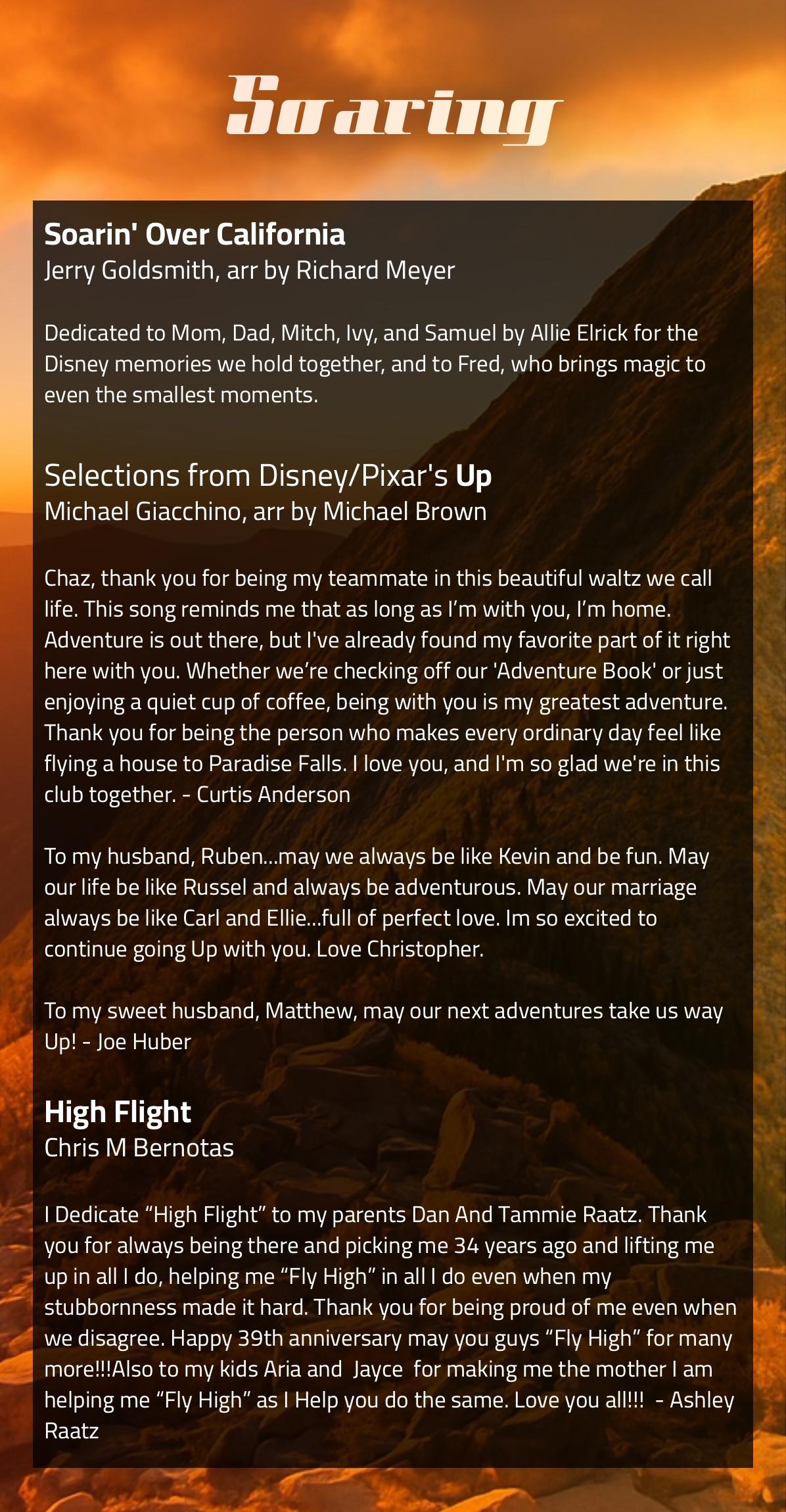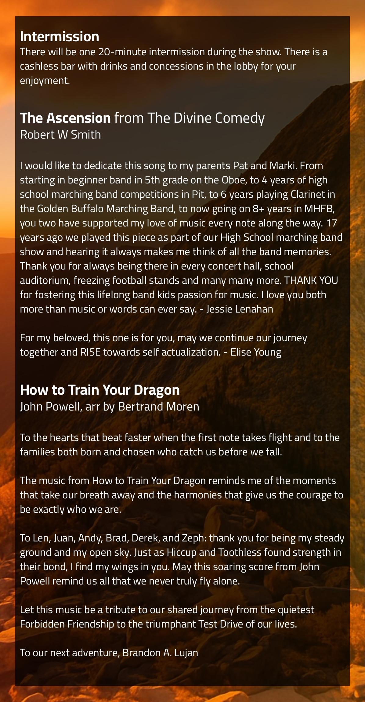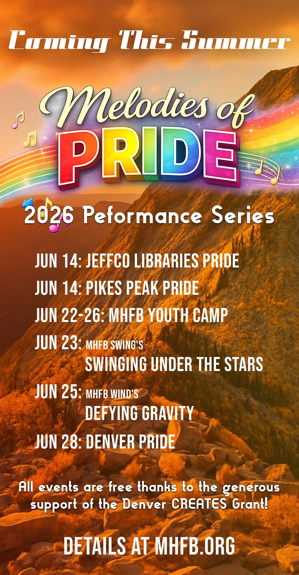 Let your spirit take flight with Soaring, a breathtaking journey through the boundless possibilities of wind ensemble music. MHFB Winds will inspire with majestic melodies and exhilarating crescendos that capture the essence of RISE. This concert embodies triumph and perseverance, lifting the audience to new heights with a program as bold and dynamic as the soaring human spirit. Feel the power of unity and the transformative force of music in a performance that will leave you energized and uplifted. Together, we soar.