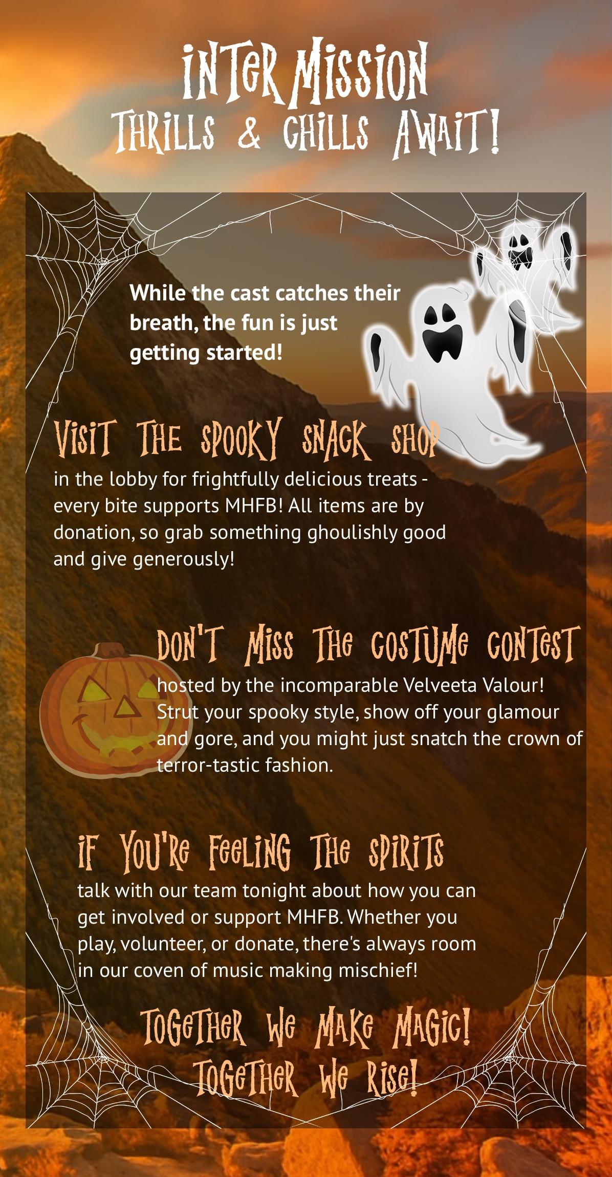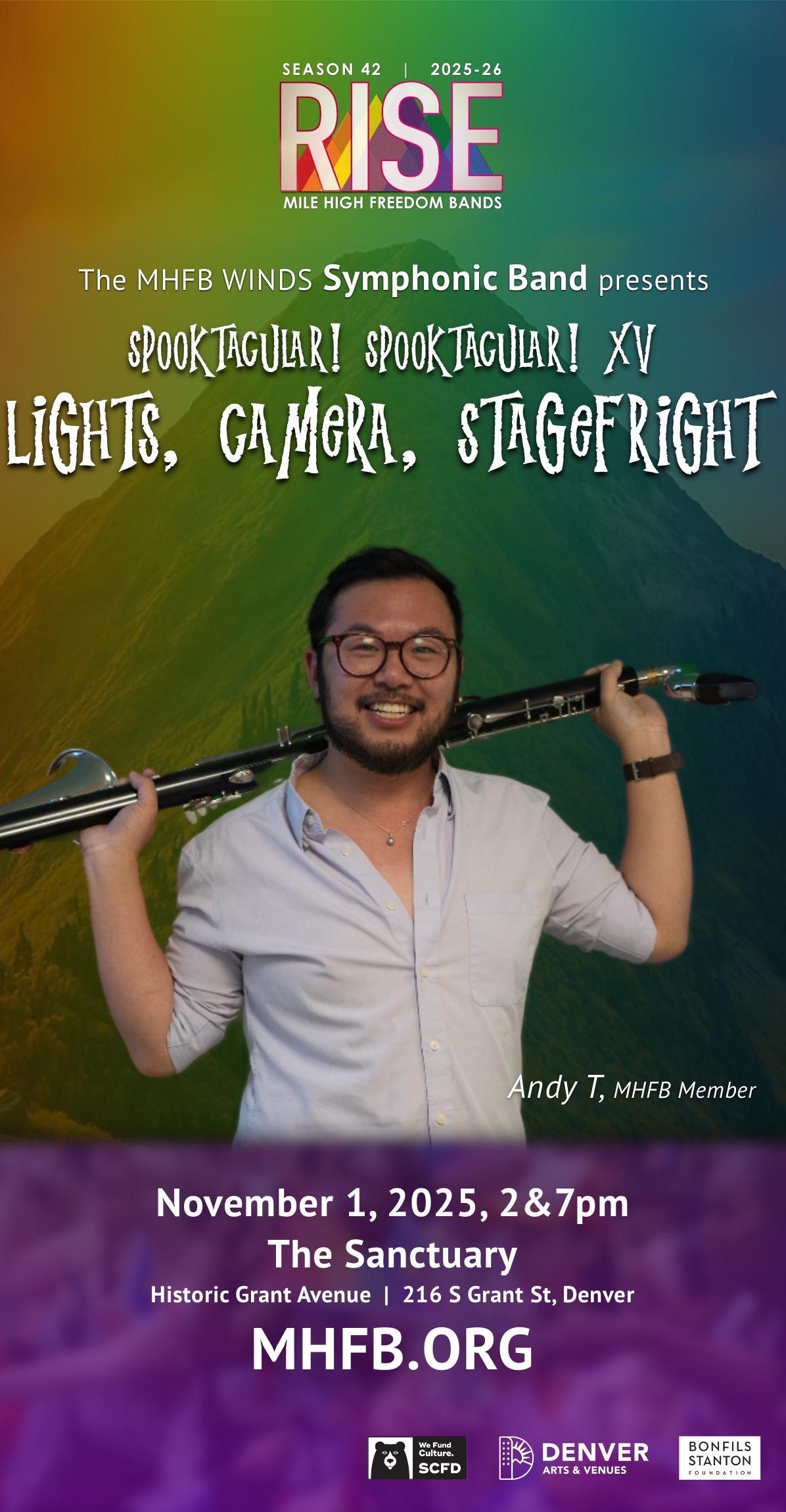 The Mile High Freedom Bands’ most thrilling tradition returns with Spooktacular XV: Lights, Camera, Stagefright! This year, it’s all about Broadway, as a cast of actors prepare to put on a new musical revue. But be aware! There is something lurking in the shadows ready to ruin everything. Will your favorite character make it out alive? Will your favorite show tunes be featured? Dress in your best costume and come out to find out. Choose between the all-ages PG-13 matinee or the daring Rated R evening show, each offering its own twist on this hauntingly fun experience. Prepare for a night of music, mystery, and mayhem that will leave you breathless. The ghosts of Broadway are ready for their encore - are you?