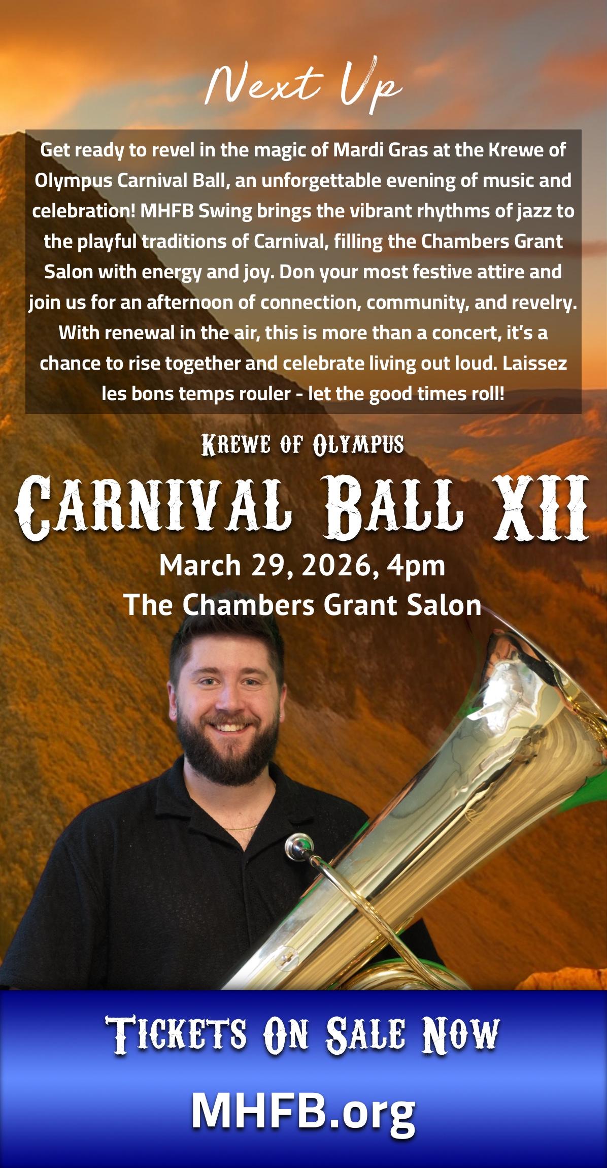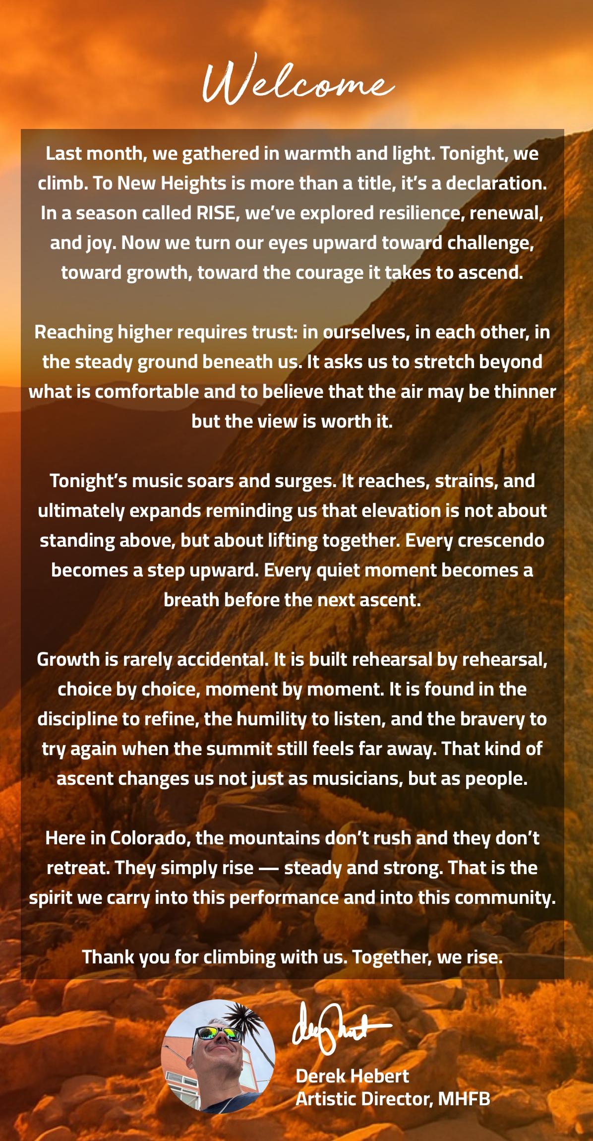 Ascend into a world of symphonic wonder with To New Heights, a performance that celebrates ambition, resilience, and the beauty of rising together. The MHFB Symphony will transport you with a masterful program that highlights the full expressive power of orchestral music in the intimate yet soaring atmosphere of The Studio Loft. Every note reaches for the skies, reminding us that when we rise as one, there is no limit to what we can achieve. Let your spirit soar in this unforgettable evening of symphonic brilliance.