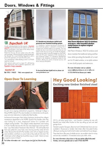 P C Henderson introduces stylish and practical new Twinbolt locking system Virtually indistinguishable from the originals, a SupaSash upgrade brings hundred-year-old windows into the 21st Century giving them a new lease of life without noticeably changing their appearance. Made from Accoya, the new sashes come with a fiftyyear guarantee, while the drained & vented double-glazing exceeds the current Building Regulations and a proven life expectancy of more than thirty years. As a refurbishment, neither Building Control nor FENSA need be involved. Add optional extras such as argon fill, self-cleaning glass, glazing bar with an authentic appearance, and SupaSash is simply unbeatable.