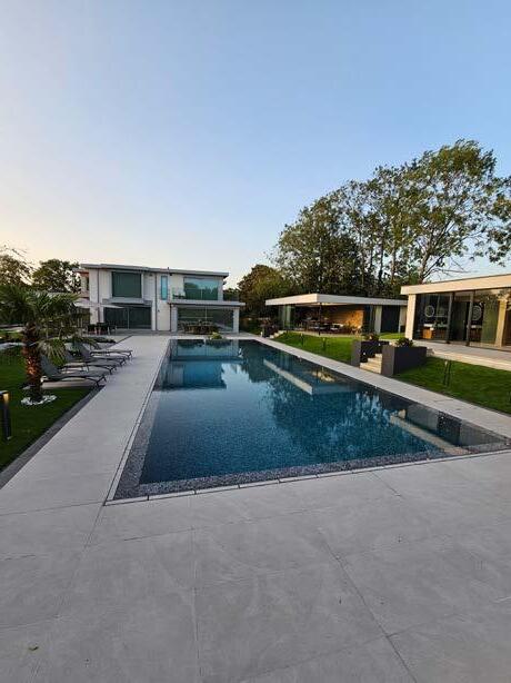 We were so proud to have been appointed to redesign the garden landscape which included a hot tub, swimming pool, barbeque, and dining building as well as a spa building with a sauna, foot spa and shower room. The design brief allowed us some freedom and as a result, we included additional features such as an outdoor shower, seating areas and an intimate sunken seating area with a fire pit.