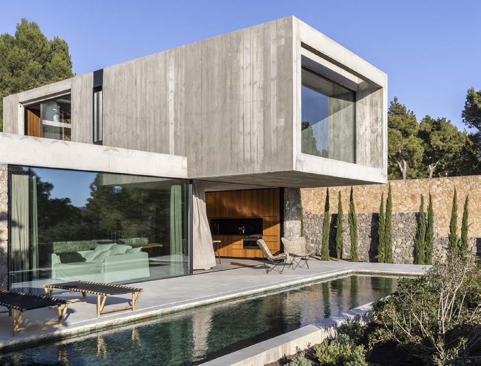 The exterior design is composed of solid cubes and interconnecting glazed voids, which are unified with a slender canopy that wraps around three sides to form outdoor terraces. Clustered vertical columns double as sculptural screens.