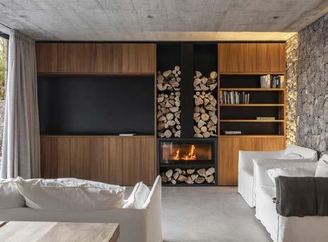 The exterior façades feature a restrained palette of materials - slabs of Giallo D’Istria marble cladding on the walls, sandstone floors, and paneled Alucabond aluminum sheets along the fireplace broken up by large glass panels. The contrast between the precision of the architectural detailing and the organic textures of the materials amplifies their inherent beauty.