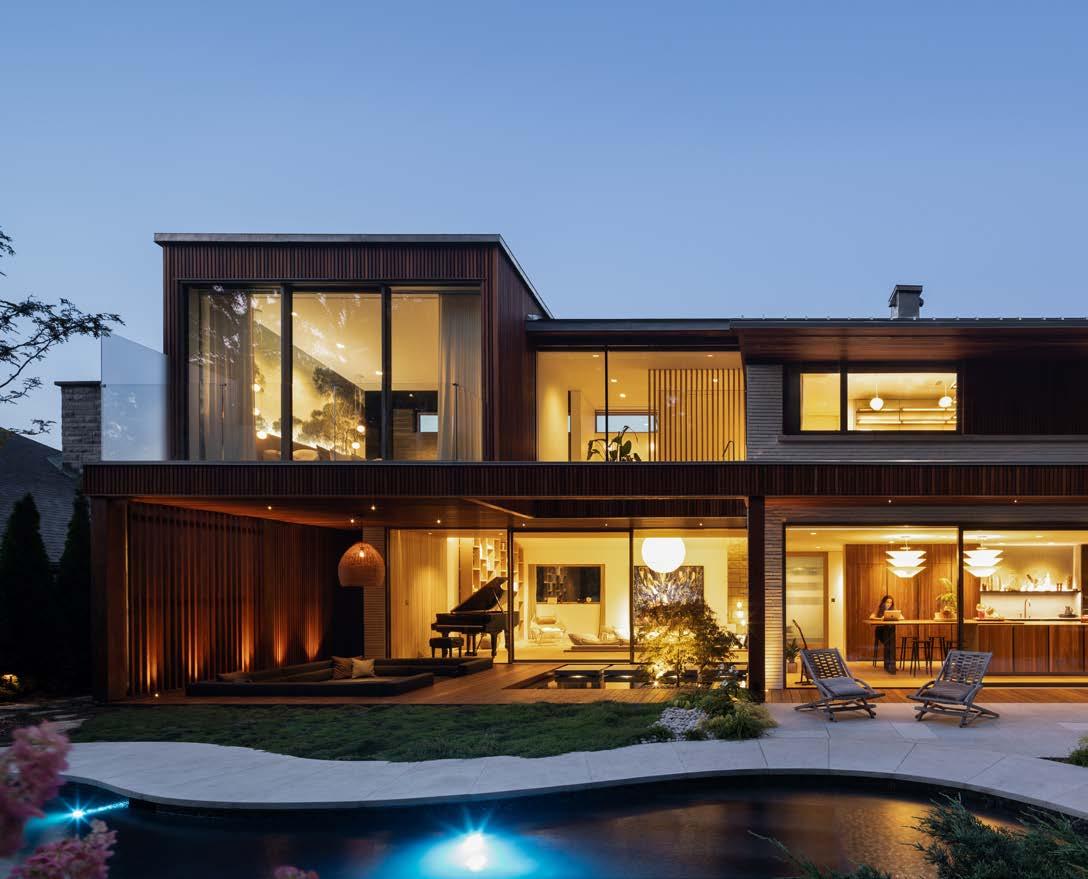 The original design, crafted by Architects Morin & Cinq-Mars, drew inspiration from the architectural work of Frank Lloyd Wright. This major transformation and extension aims to honour the historical essence, while establishing a serene retreat on Mount Royal. The interventions pay homage to this iconic architect and integrate Japanese and Scandinavian influences, which are highly appreciated by the owners. The result is a spacious, welcoming living space that is deeply connected to the natural beauty of the surrounding forest.