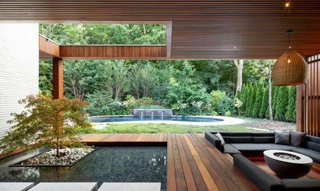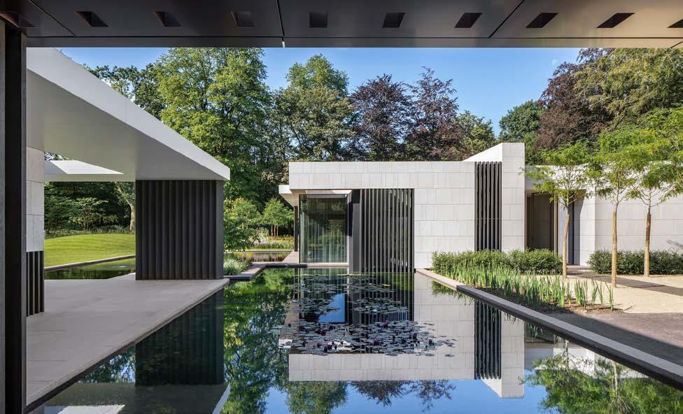 The property's landscaping seamlessly integrates with the surrounding nature. This essential component of the project has been meticulously crafted to create a Zen garden infused with Japanese influences. Water also plays a central role, appearing in various forms; tranquil ponds marking the approach to the main entrance and the transition to the sunken outdoor lounge area, as well as a fountain in the side courtyard. Water contributes to the serene ambiance overall, reflecting light and evoking soothing sounds. Additionally, river pebbles add to this sense of tranquility, while the substitution of conventional grass with thyme enhances the landscape's unique appeal.