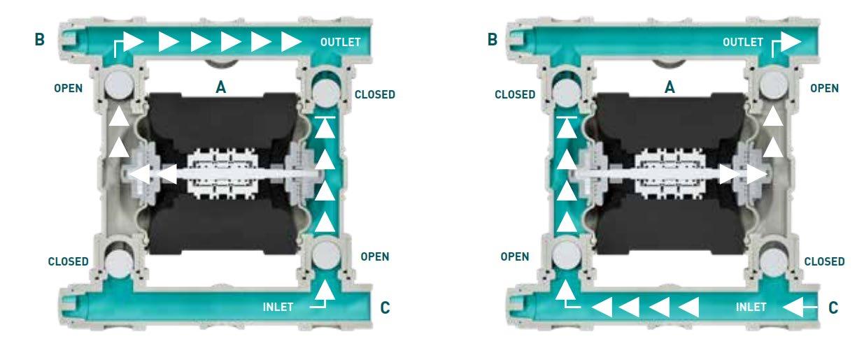 Positive displacement design ensures that pumping performance remains regardless of viscosity. Internal components act as valves ensuring fluid output is maintained across a variety of thick or thin fluids and temperatures. RUN DRY