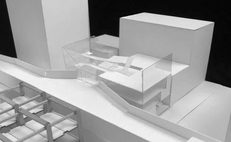 Designed as a pavilion for exhib iting sculptures from the School of Visual and Performing Arts, an emphasis on tectonics guided the development of this project. The complications of displaying a three dimensional object are invit ed and engaged with as an oppor tunity to rethink the typical view er-artwork spatial engagement. A ramp bisects the layered structural system, taking the visitor up, through, and in between. The ramp transports the visitor above and around the sculpture courtyard to the interior exhibition space before descending back down and outside. The exterior frame retains a consistent grid, while the interior grid’s density varies, fram ing unique viewpoints when looking down at the artwork below. The archi tecture acts as a viewing machine, en couraging more complex relationships to the work. The layered transparency of the frames provide a dynamic view of the architecture from the exterior.