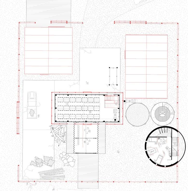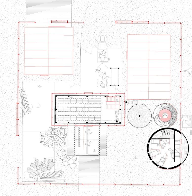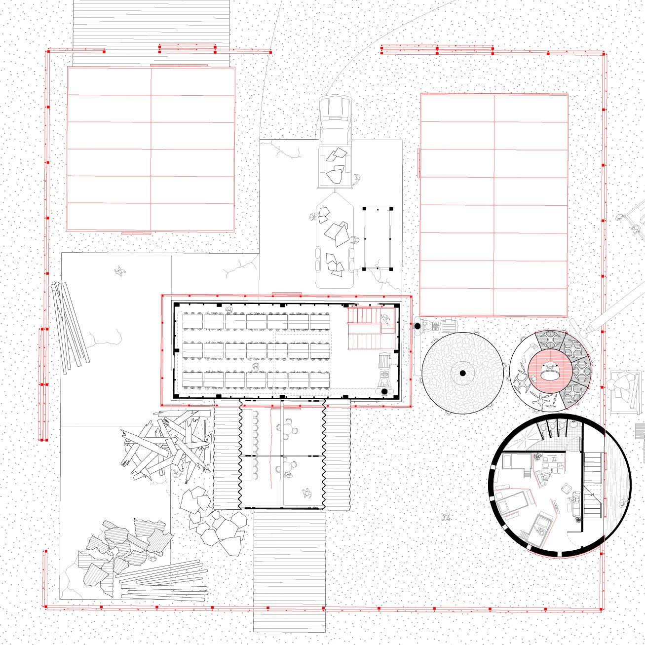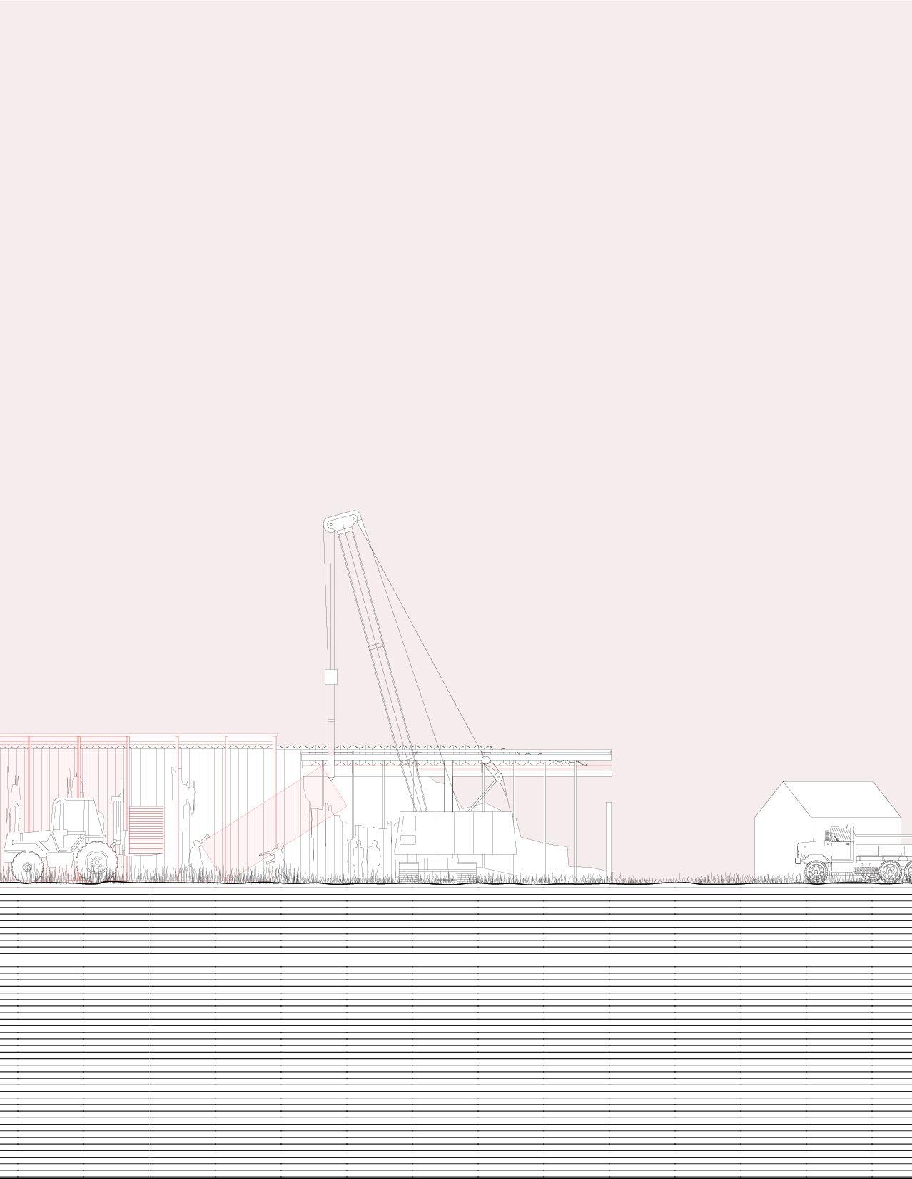 The assembly team moves in to con struct this temporary shelter and oc cupies the existing buildings, tempo rarily pausing their decay. They adapt the surrounding center pivot irrigators to burn, churn, and sow native seeds, repixeling the fading borders of the Jeffersonian Grid with a 'new nature'.