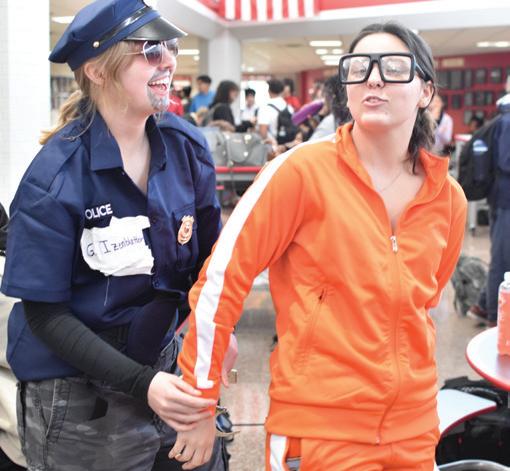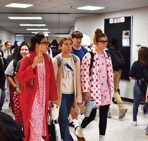 DRIVE (FAR AWAY) Getting out of the car in emo attire Monday morning, Daniella Lesina, junior, holds senior Brooke Lesina’s textbook and calculator. Monday was nerd day for seniors, while the rest of the grades dressed as high school stereotypes, like emo, preppy and jocks. (photo by marianna young) MOVIN’ AND GROOVIN’ Speaker in the air playing 50s music, seniors Aliciana McGuire, Ariyah Jamerson, Kam Hubbard and Nneka Oniah dance together in the Commons while other students watch. Canes and walkers in hand, they dressed up for senior citizen day Wednesday. (photo by heidy sanchez)