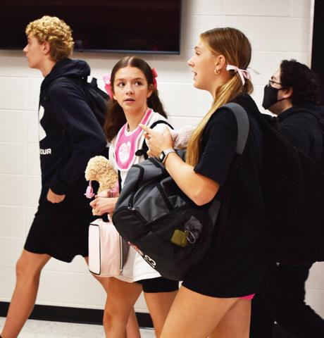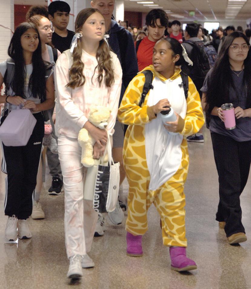 BACK IN TIME Dressed in onesies and stuffed animal in hand, freshmen Deni Staehly and Amélie Adam walk past the main office on Wednesday. While the seniors dressed up as senior citizens, freshmen were toddlers, sophomores were pre-teens and juniors were adults. (photo by marianna young)