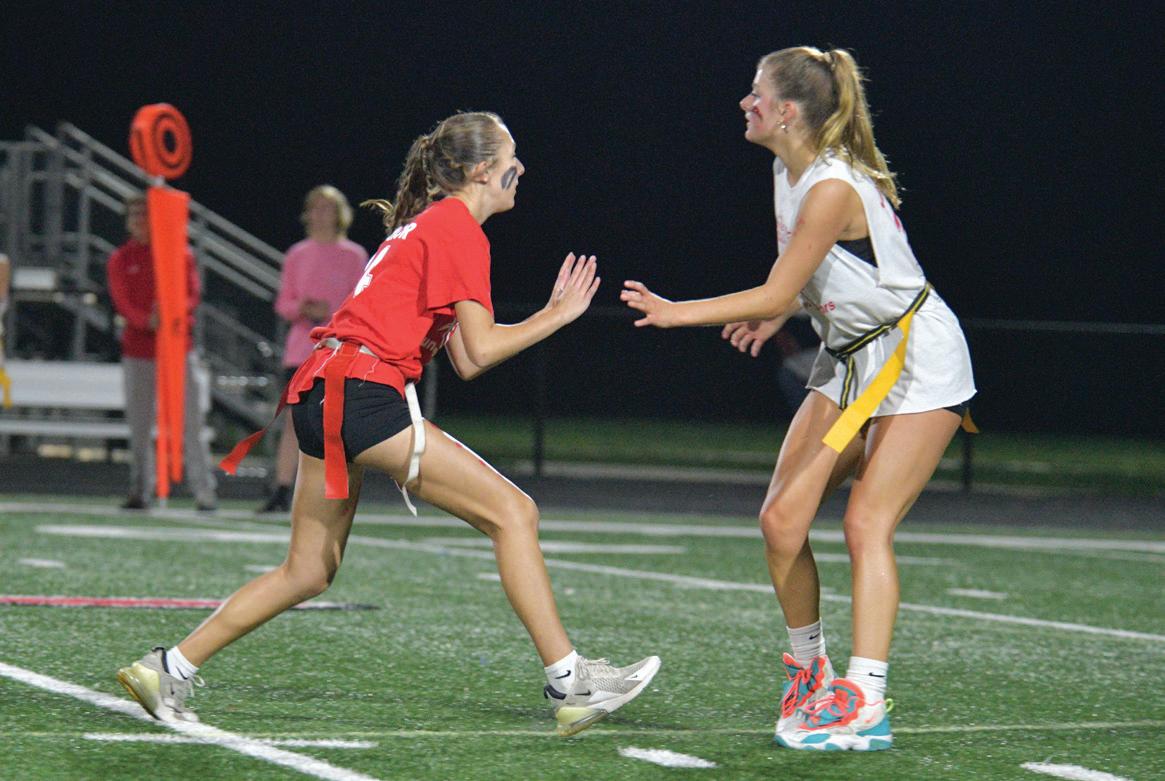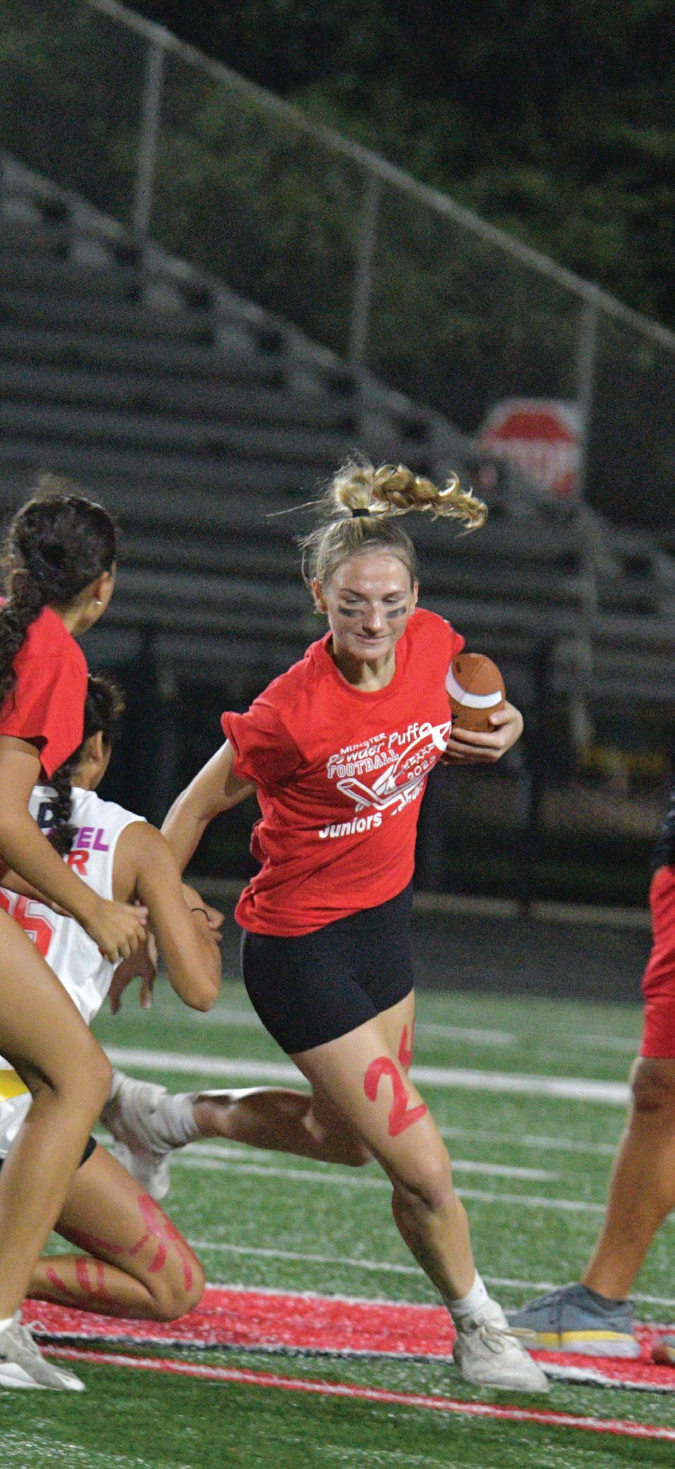 Scanning the busy field for junior Cece Mason, Brooklyn Kuna, junior, throws the football down the right side of the crowd of girls. Ponytails and flag football belts whipping through the air, she catches the ball and sprints to the endzone. For the first time since 2019, Student Government organized a powderpuff game, which is a flag football game between junior and senior girls. With crowds of students in pink attire rushing the field after the juniors won the game 28-6, the team celebrated by spraying water all over the field and gathering in a huddle. Some players, specifically junior Josie Speckhard, predicted the outcome of the game at the first practice Sept. 18.