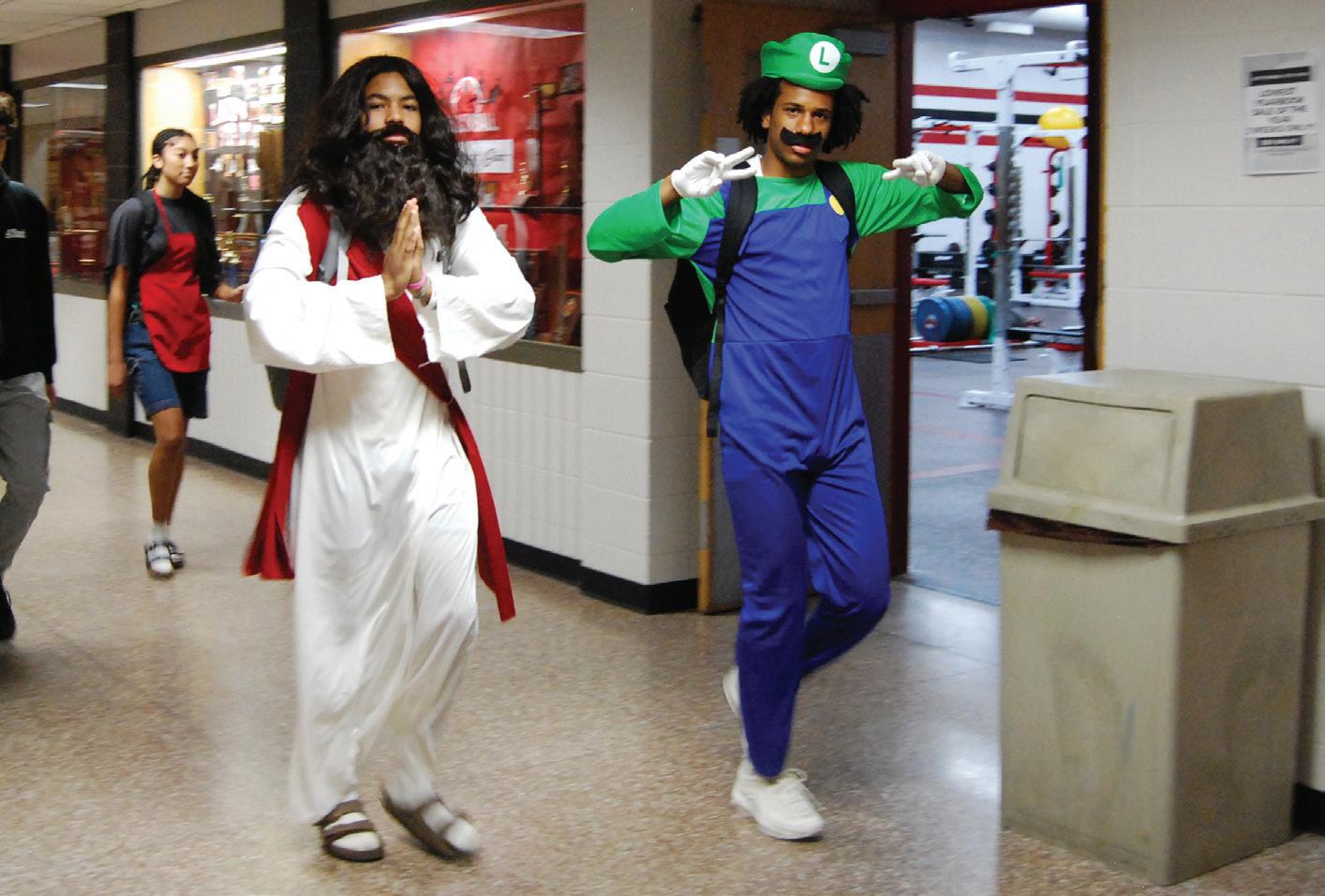 JEEZ LUI-Z Walking past the weight room on random costume day Tuesday, seniors Joe Reed and Jaelin White dressed up as Jesus and Luigi.