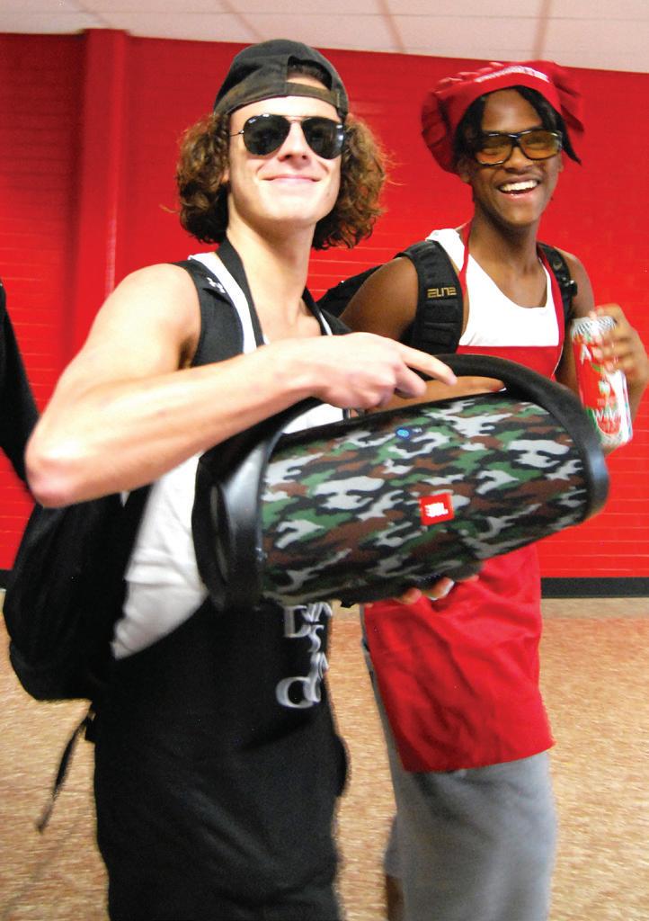 FIRE UP THE GRILL Blasting typical dad music every passing period, sophomores Luke Hayden and Josh Malloy show off their BBQ dad outfits. (photo by emma starkey)