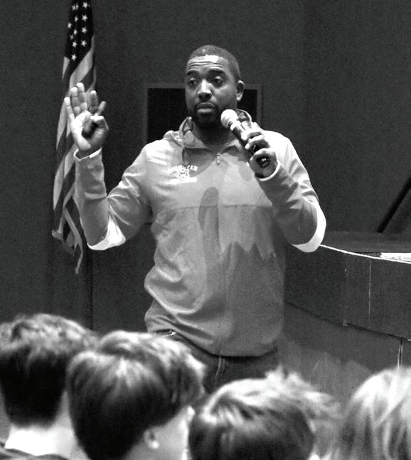 WISE WORDS At an assembly after school Feb. 15. held for the football team, the new football head coach, Mr. Romison Saint-Louis, motivates and voices his goals for his upcoming fall season. (photo by marianna young)