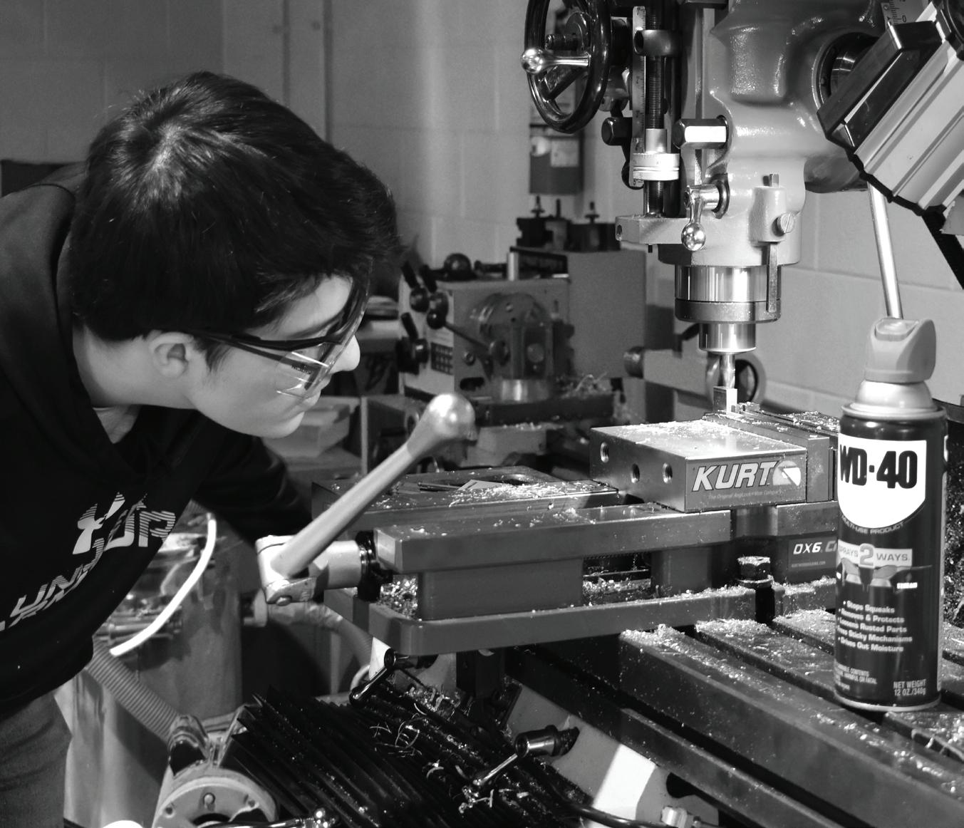 METAL MEETS MILL While using the vertical mill in the Fab Lab, Muaaz Shareef, senior, looks closely at a piece of metal that he surfaces down. The mill is very precise when taking away unwanted material, making the perfect part needed for this year’s robot. “It’s very good about creating and giving you creative freedom and liberties over everything,” Muaaz said.