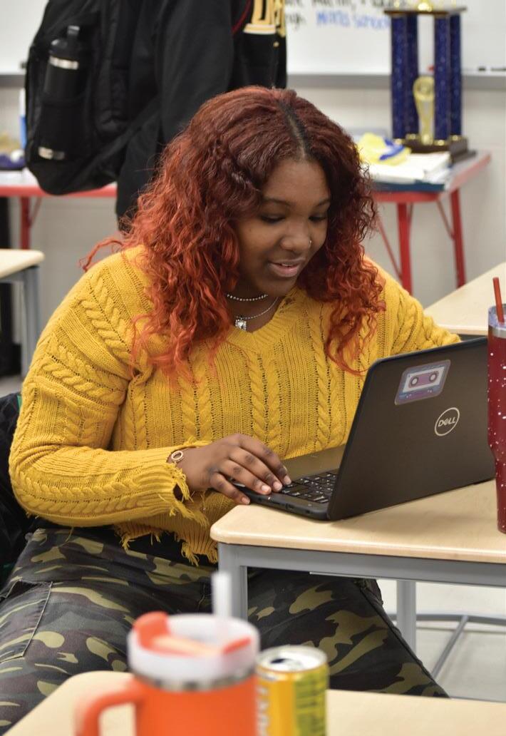 for BCC’s unity day Feb. 9, Cyia Payne, sophomore, types on her laptop during English class. She hopes to see more community events surrounding BCC. “I feel like everyone in the school would benefit from doing something like that, not just us in BCC,” Cyia said. “We could get black